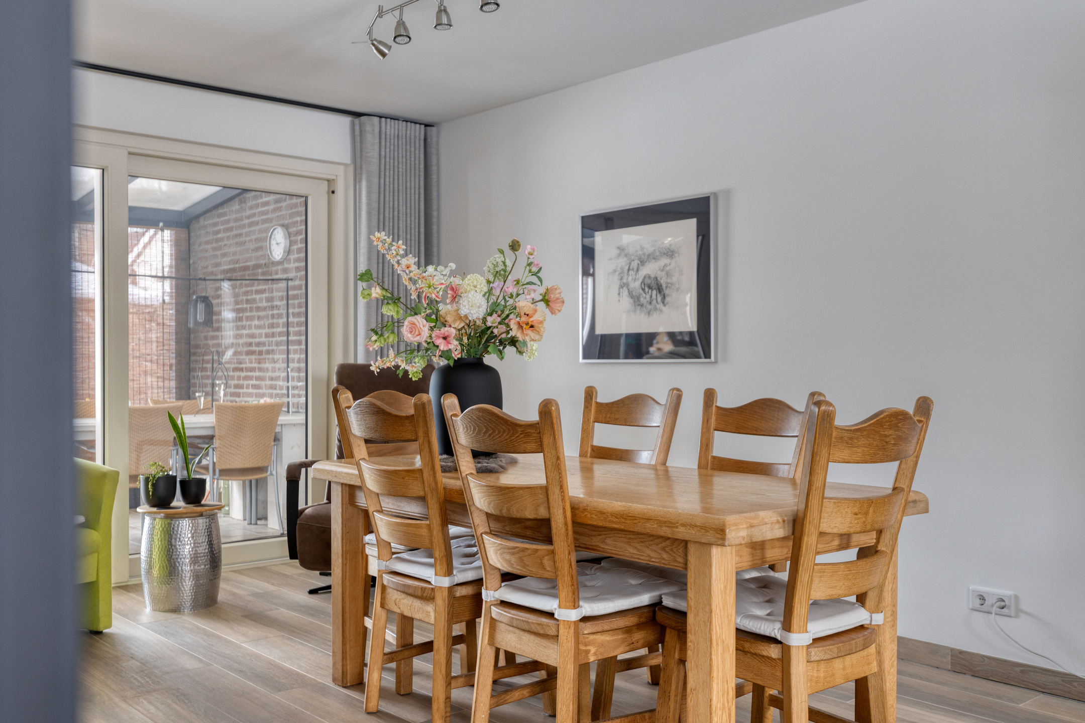 De leefkeuken straalt luxe en comfort uit en is voorzien van moderne apparatuur, waaronder een combi-oven/magnetron, ruime koelkast, vriezer, vaatwasser op hoogte, Quooker en een inductiekookplaat met geïntegreerde afzuiging. De openverbinding tussen de keuken en eet/woonkamer maakt het een stijlvol geheel. Vanuit de eetkamer geniet je van een prachtig uitzicht op de serre en achtertuin.
