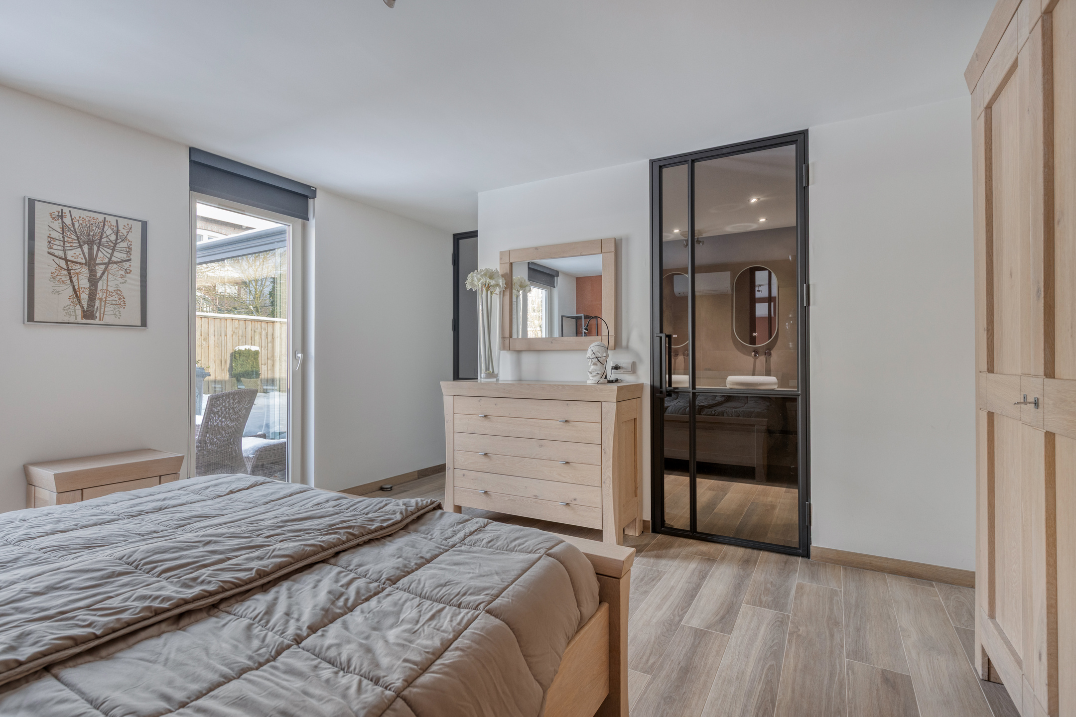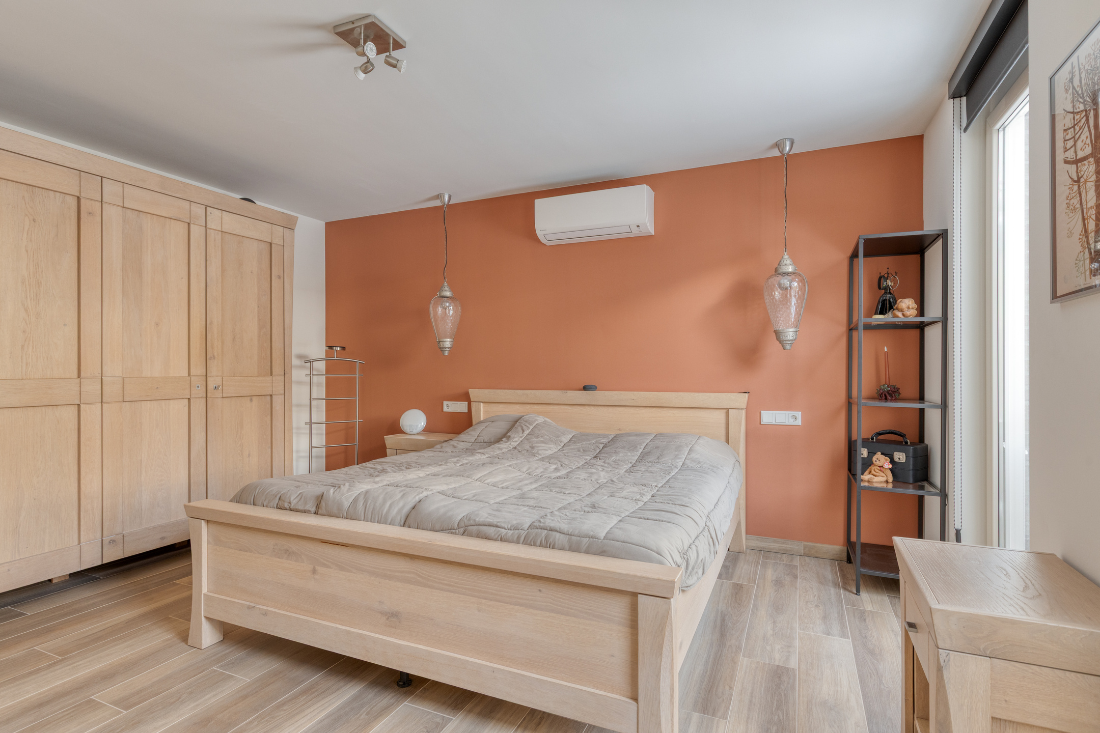 De badkamer en slaapkamer zijn in directe verbinding met een stijlvolle industrie-look glazen deur. De slaapkamer is voorzien van de doorlopende tegelvloer met vloerverwarming, airconditioner voor verkoeling en verwarming en natuurlijke ventilatie middels de raampartijen.