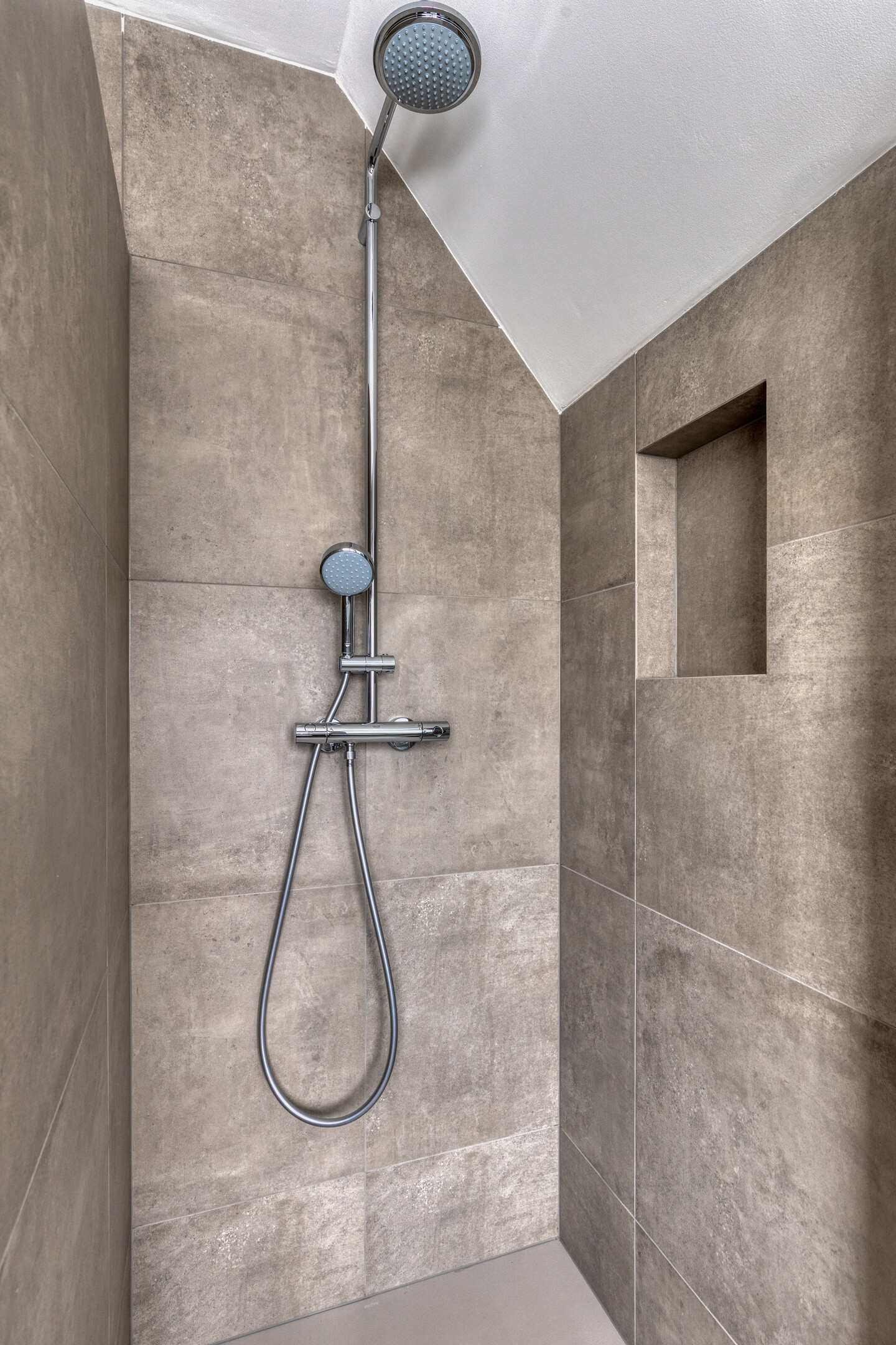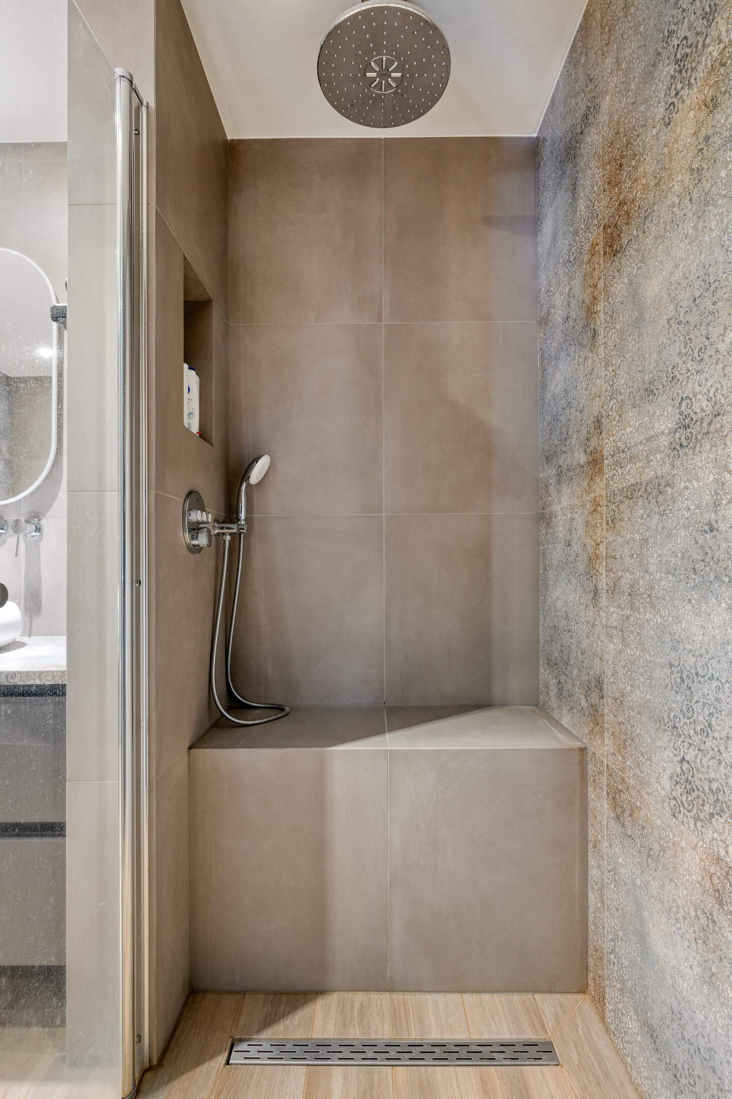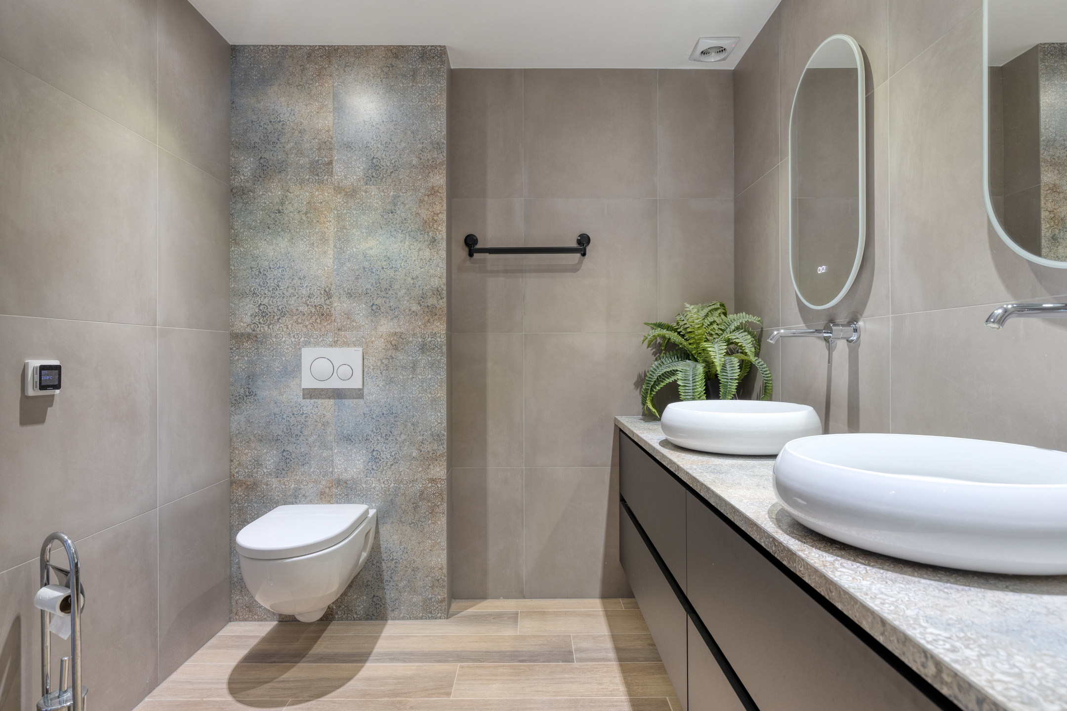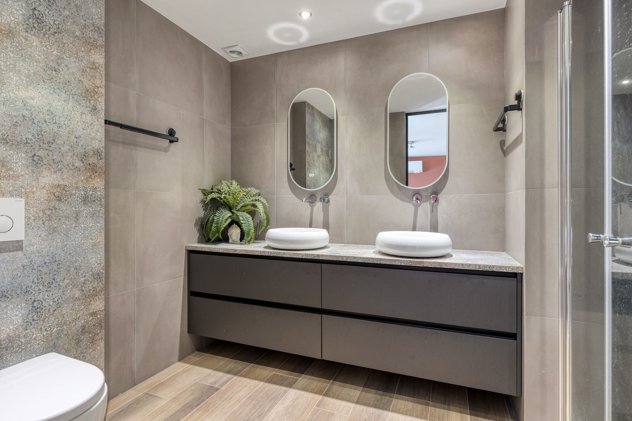 De badkamer is met zijn moderne en warme looks een plek om heerlijk te ontspannen en genieten, de badkamer is dan ook van alle gemakken voorzien: Vloerverwarming, dubbel wastafel met bijbehorend meubel voor extra opbergruimte, een dubbele inloopdouche en een zwevend toilet.