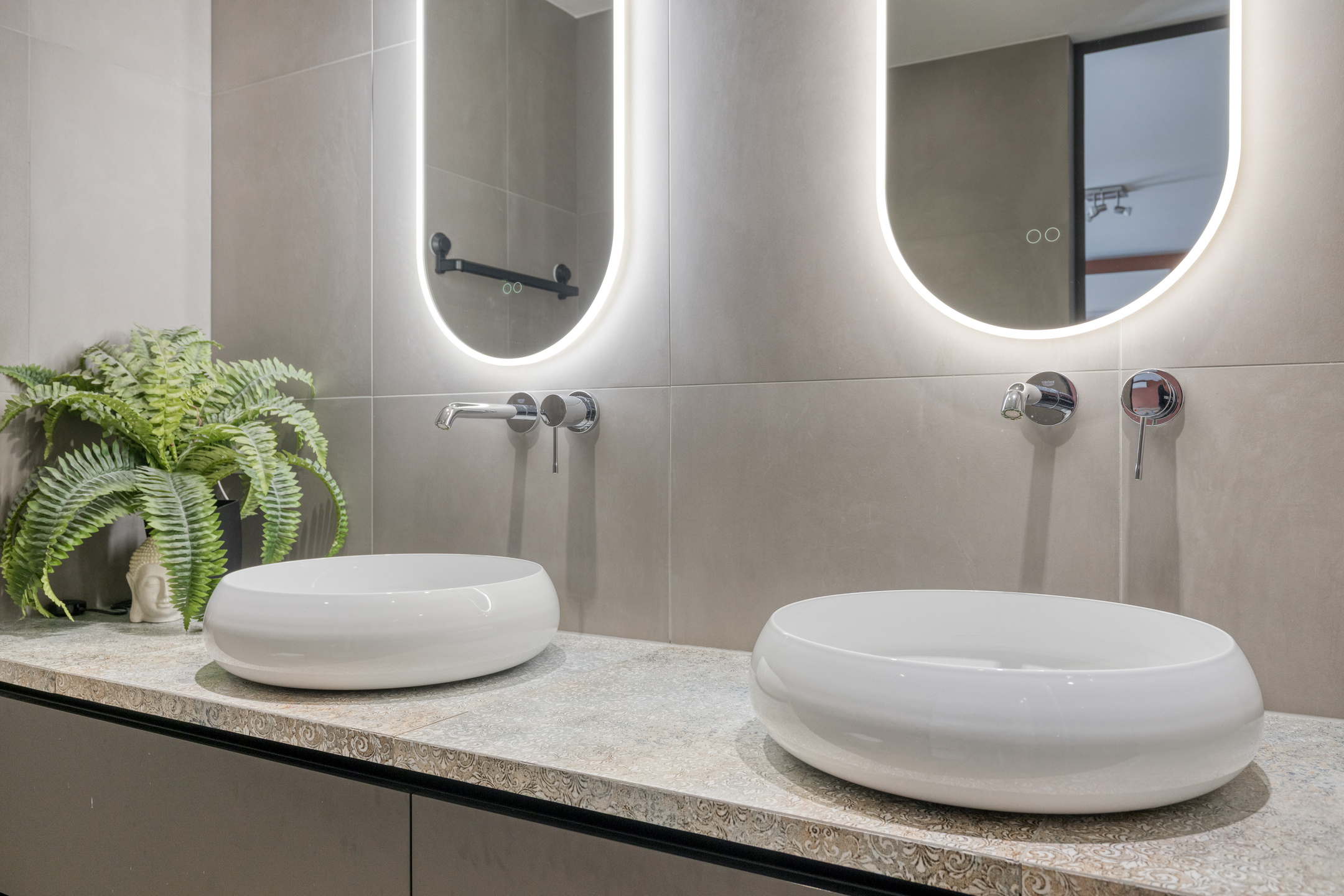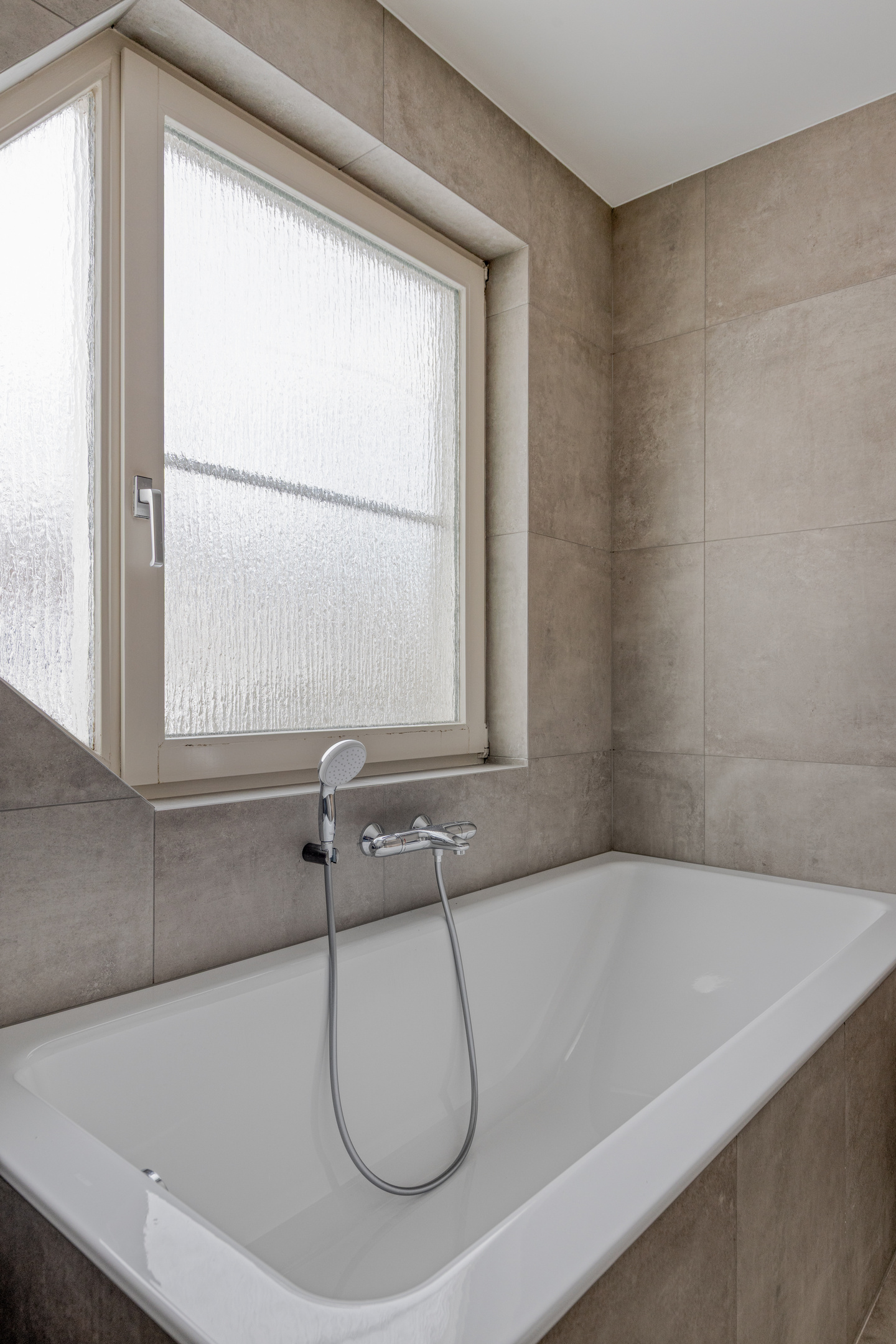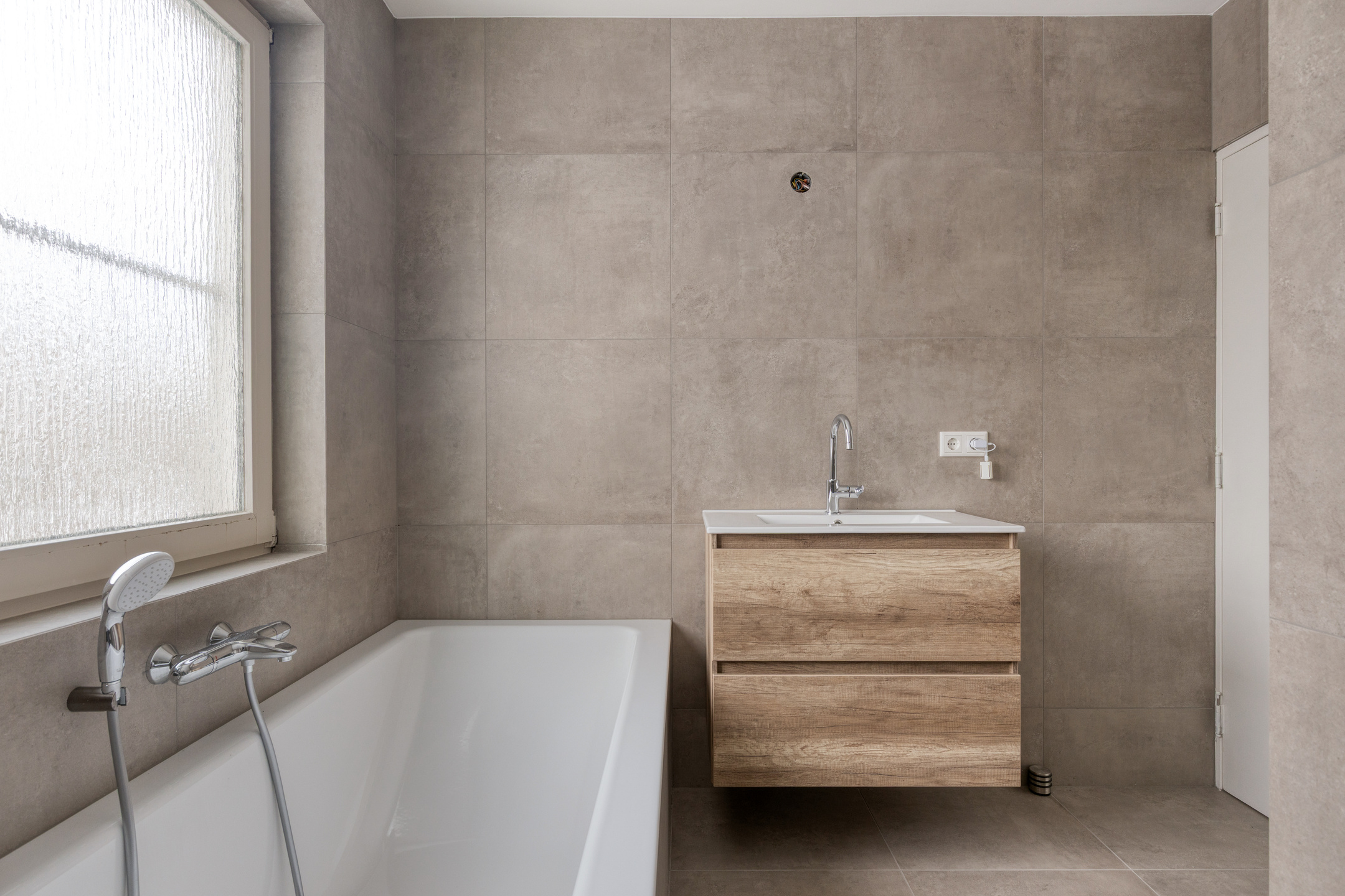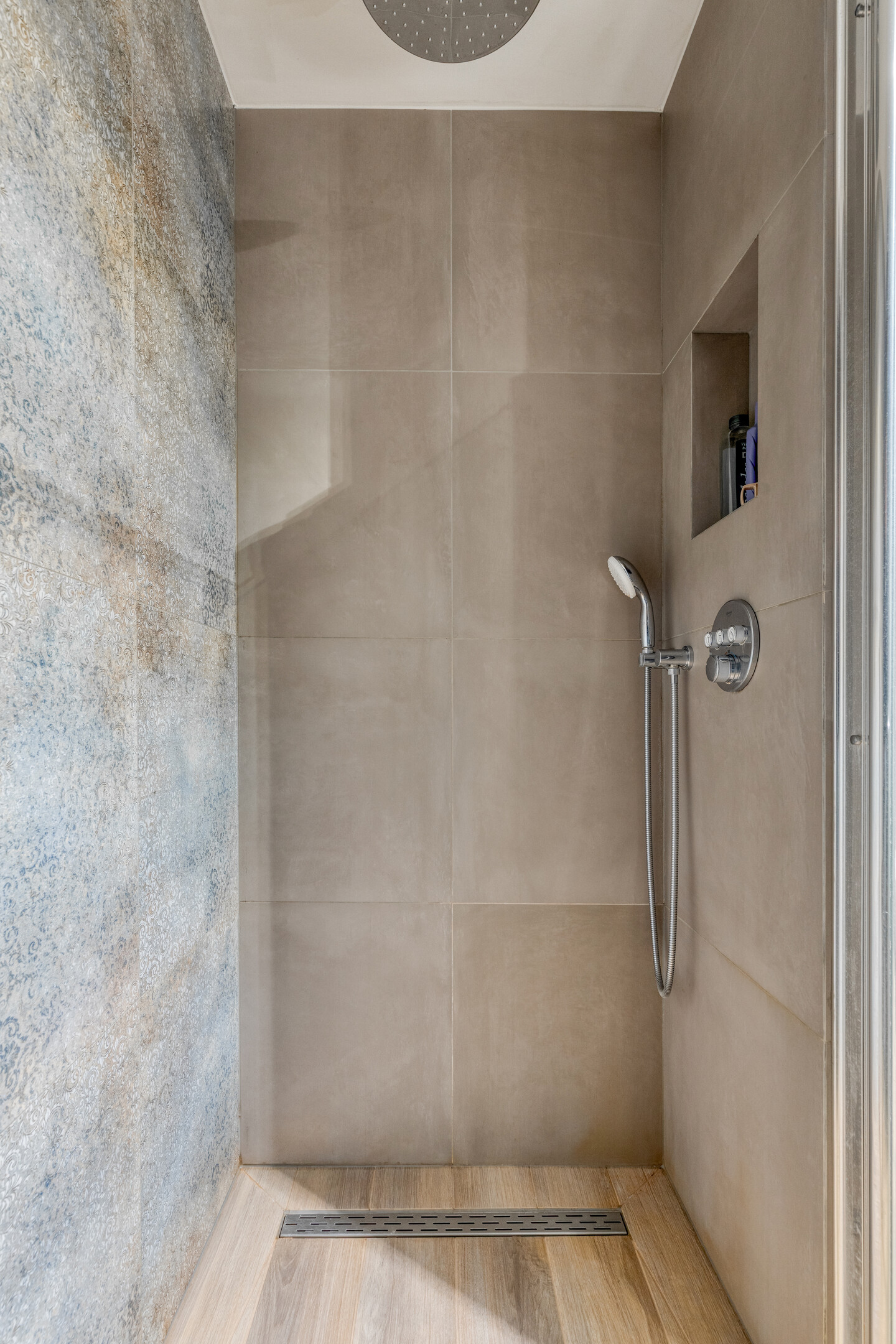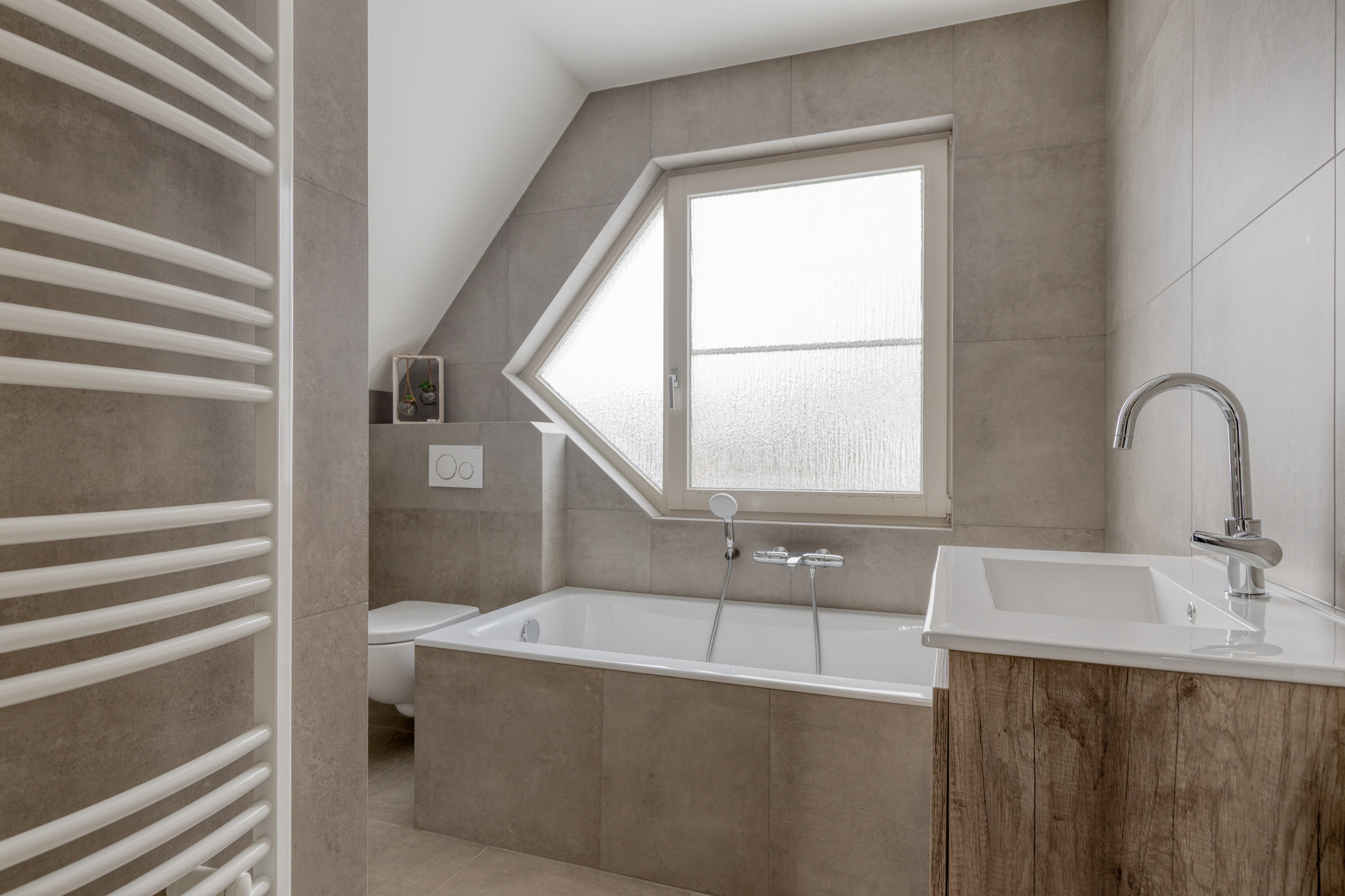 De badkamer is met zijn moderne en warme looks een plek om heerlijk te ontspannen en genieten, de badkamer is dan ook van alle gemakken voorzien: Vloerverwarming, dubbel wastafel met bijbehorend meubel voor extra opbergruimte, een dubbele inloopdouche en een zwevend toilet.