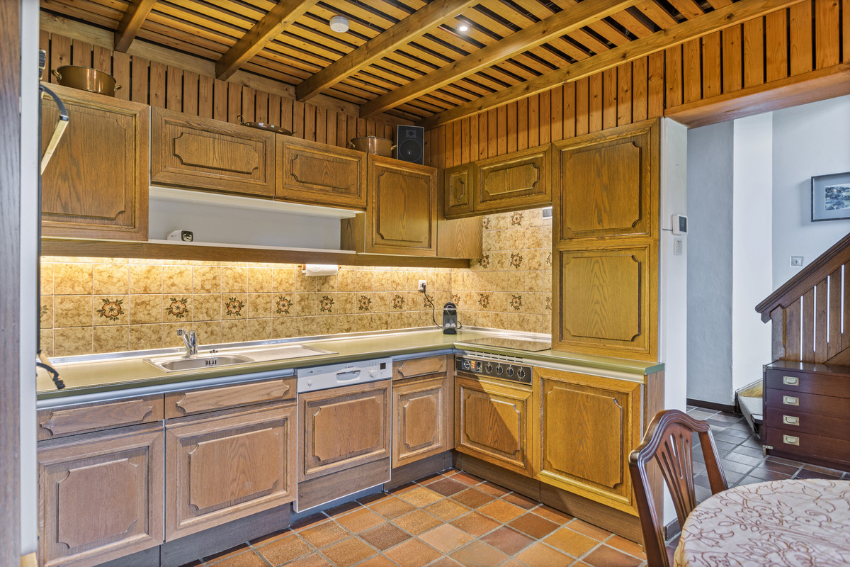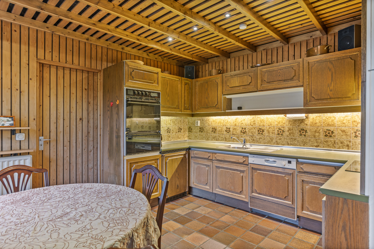 De keuken, met zicht op de ruime, groene tuin, is een fijne plek om te koken en biedt toegang tot een extra (werk/slaap)kamer, de praktische kelder en de inpandige garage.