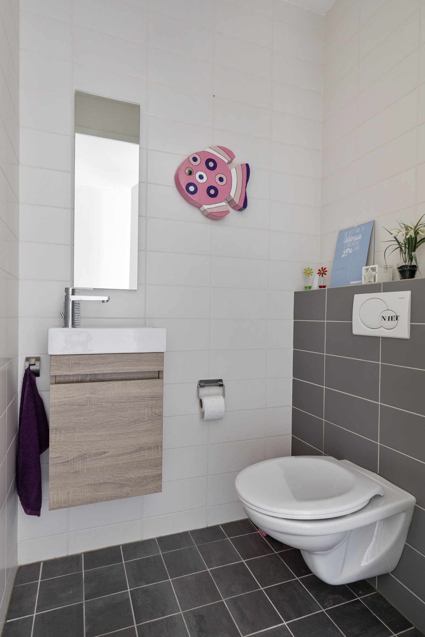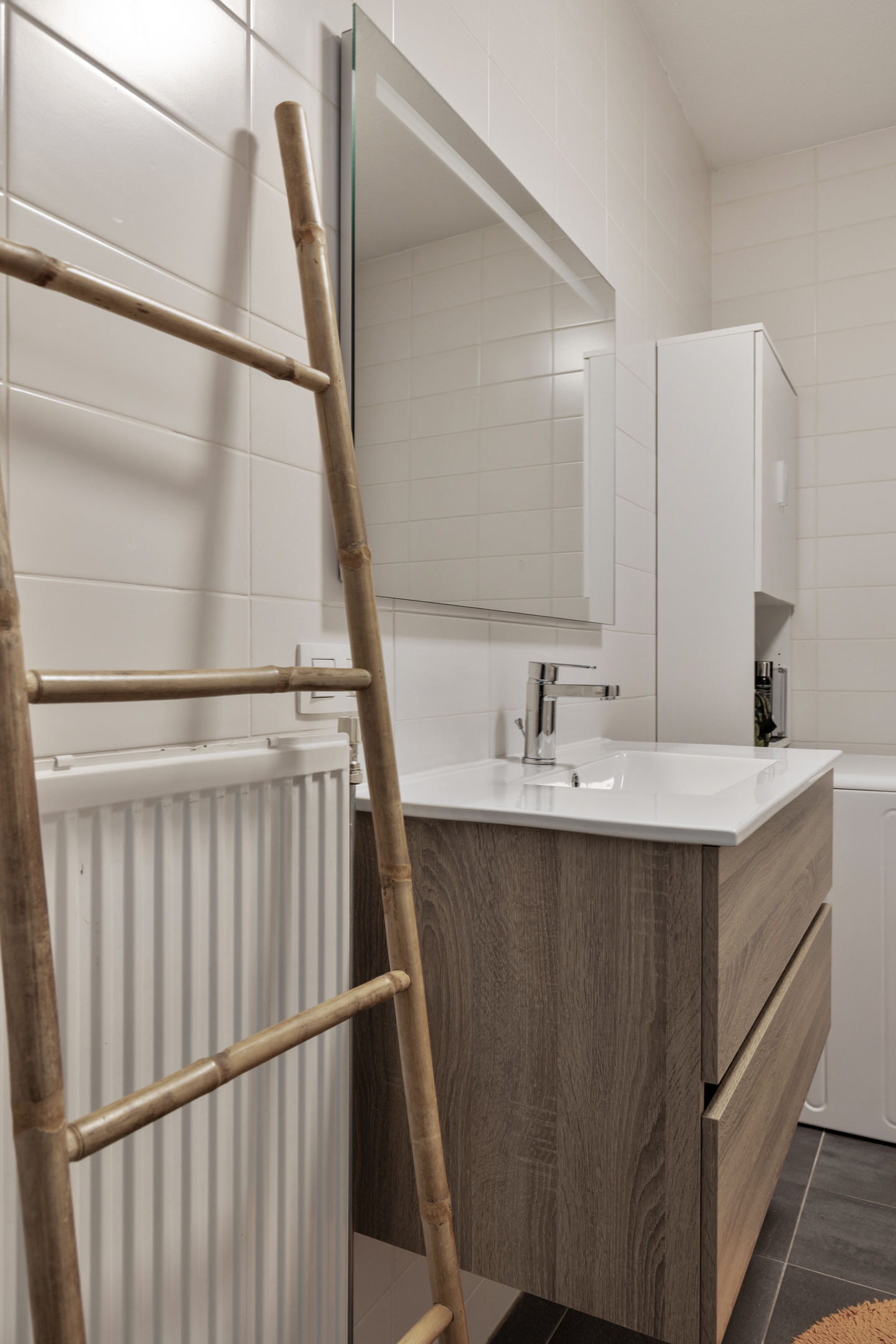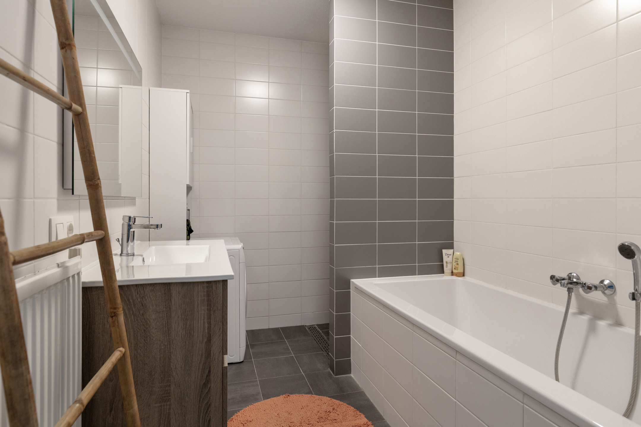 De badkamer is royaal van opzet en voorzien van een wastafel met bijpassend meubel, een ligbad, een inloopdouche en de aansluiting voor een wasmachine. De gehele badkamer is betegeld, wat het onderhoud eenvoudig en praktisch maakt.