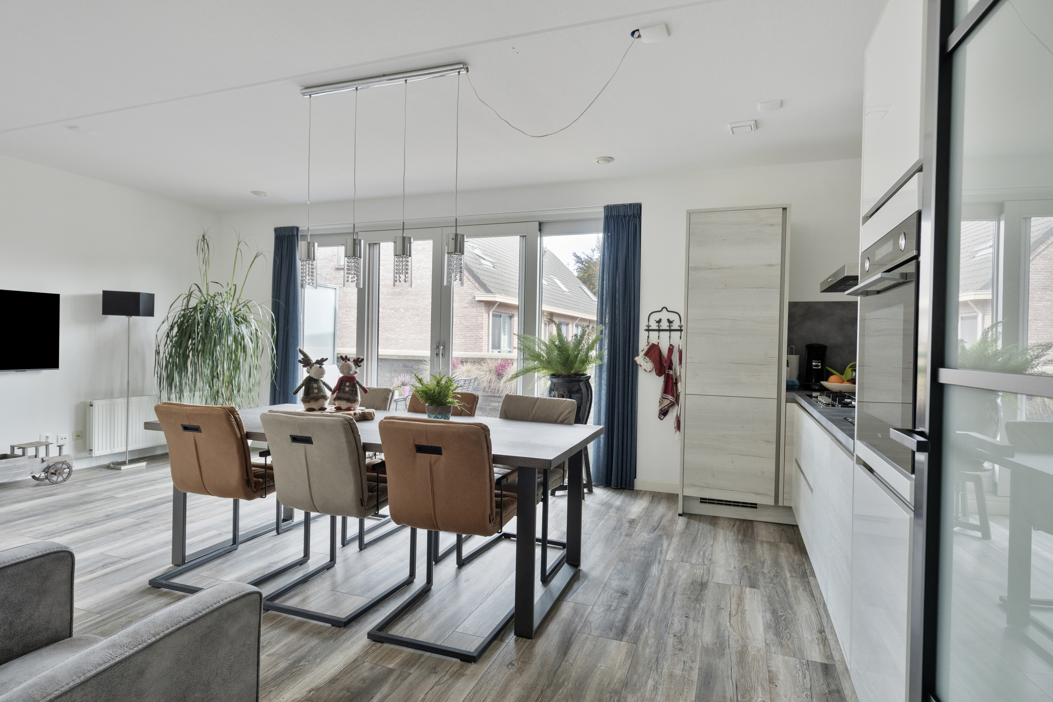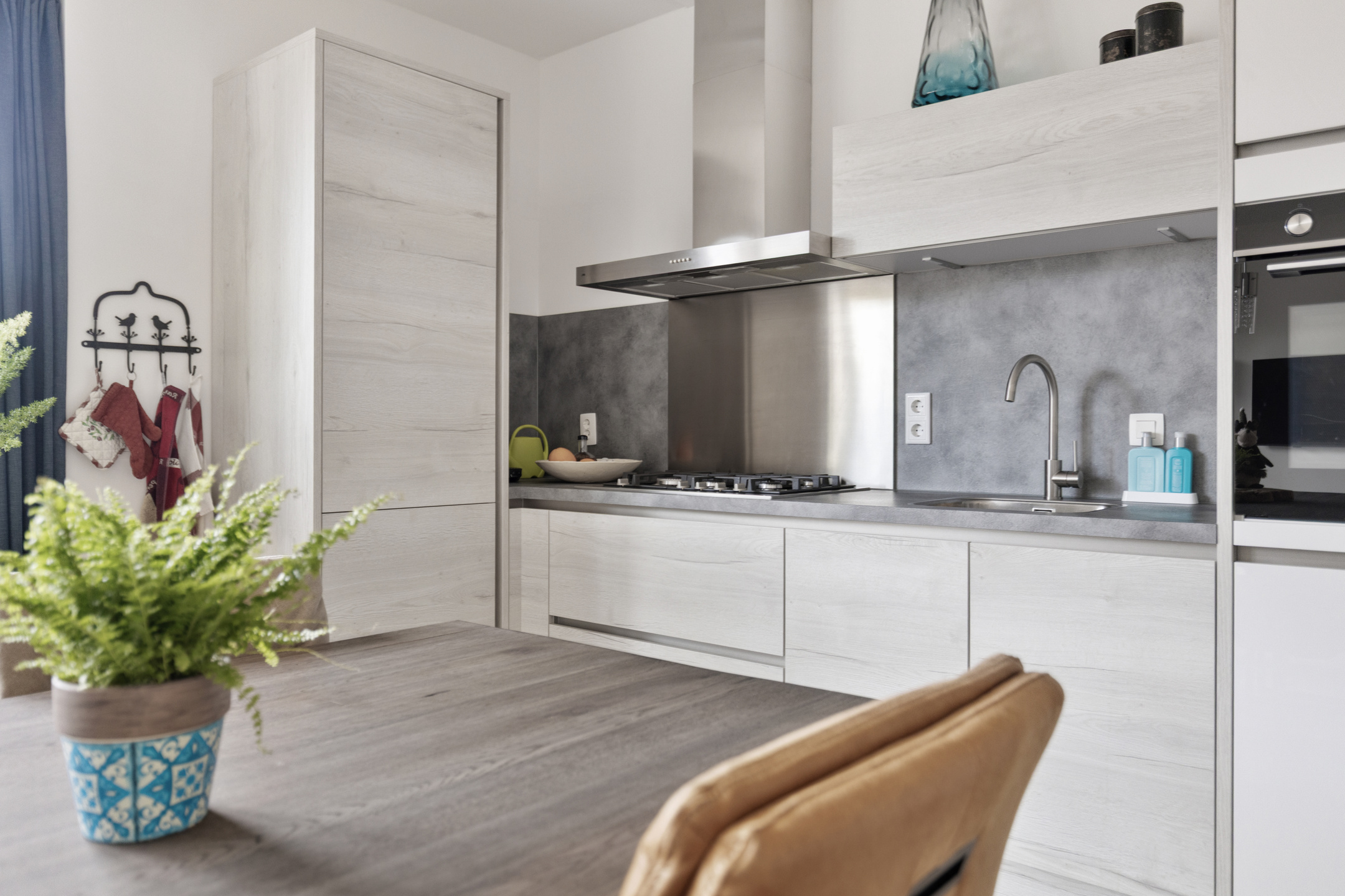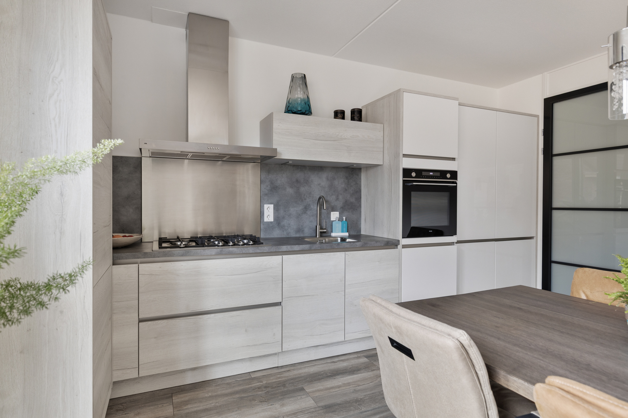 De leefkeuken is ruim van opzet en geniet een prettige lichtinval. In 2021 is de keuken volledig vernieuwd en voorzien van een moderne afwerking. De keuken beschikt over een 5-pits gaskookplaat met afzuigkap, een koel-vriescombinatie, een ruime combi-oven/magnetron, een vaatwasser en diverse boven- en onderkasten die zorgen voor praktische opbergruimte.