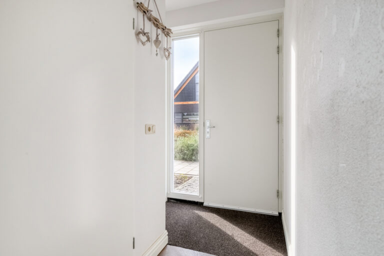 Via de entree betreedt u de ruime hal. Hier vindt u het gastentoilet, de meterkast, de provisiekast en de trapopgang naar de eerste verdieping. De hal is voorzien van een prachtige houtlook visgraat pvc-vloer met vloerverwarming, die doorloopt over de gehele begane grond. Dit zorgt voor een rustige, luxe uitstraling en een aangenaam wooncomfort.