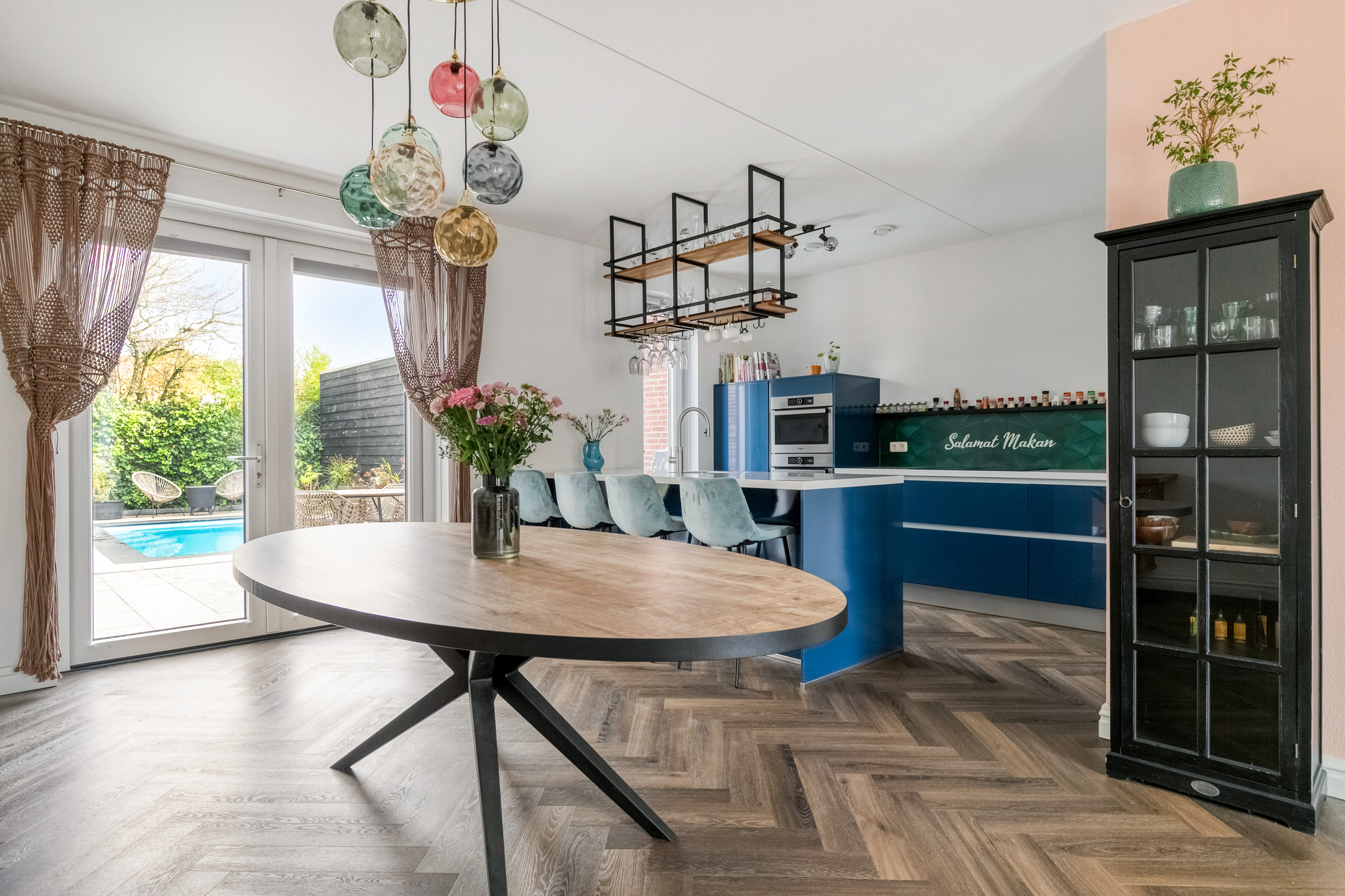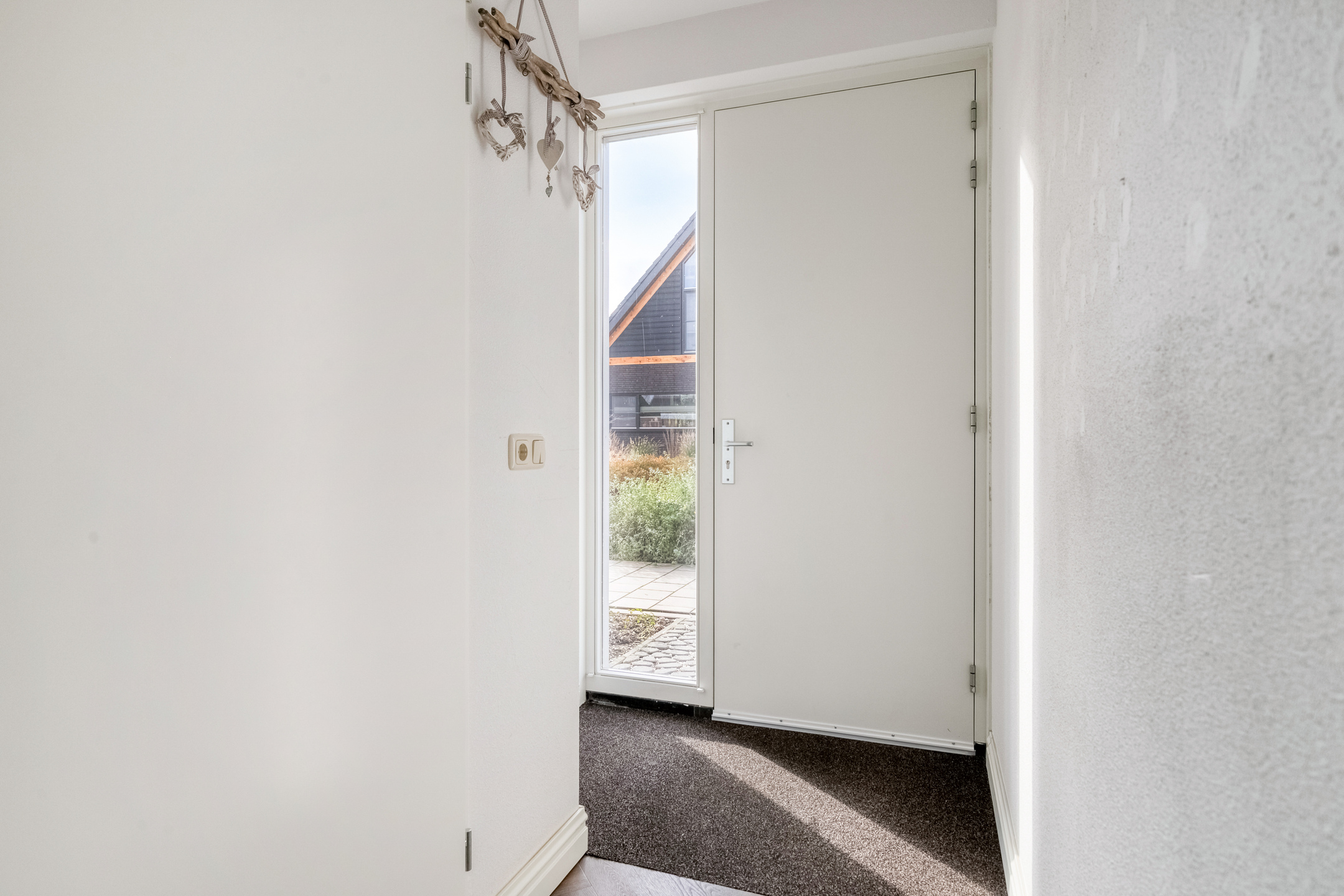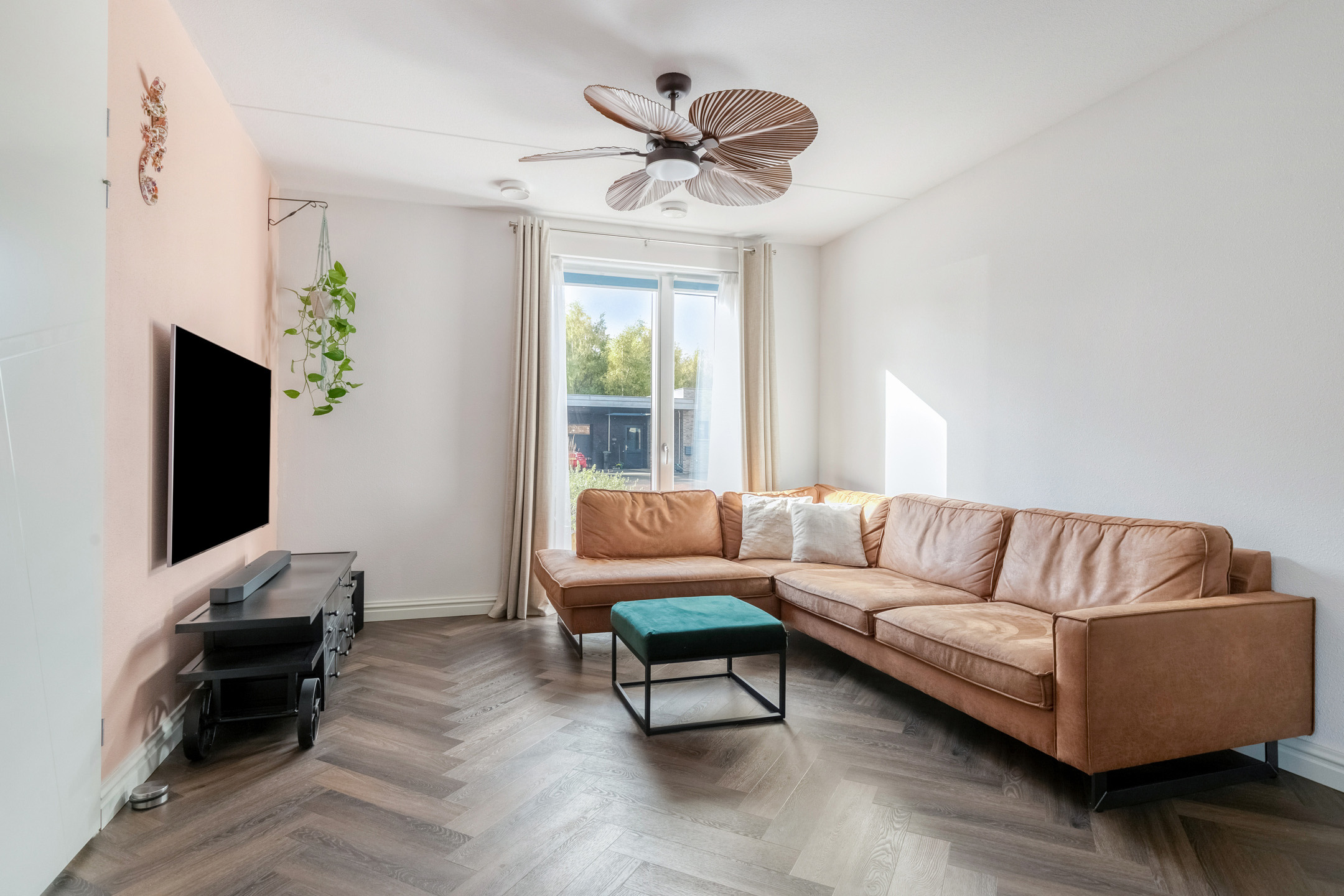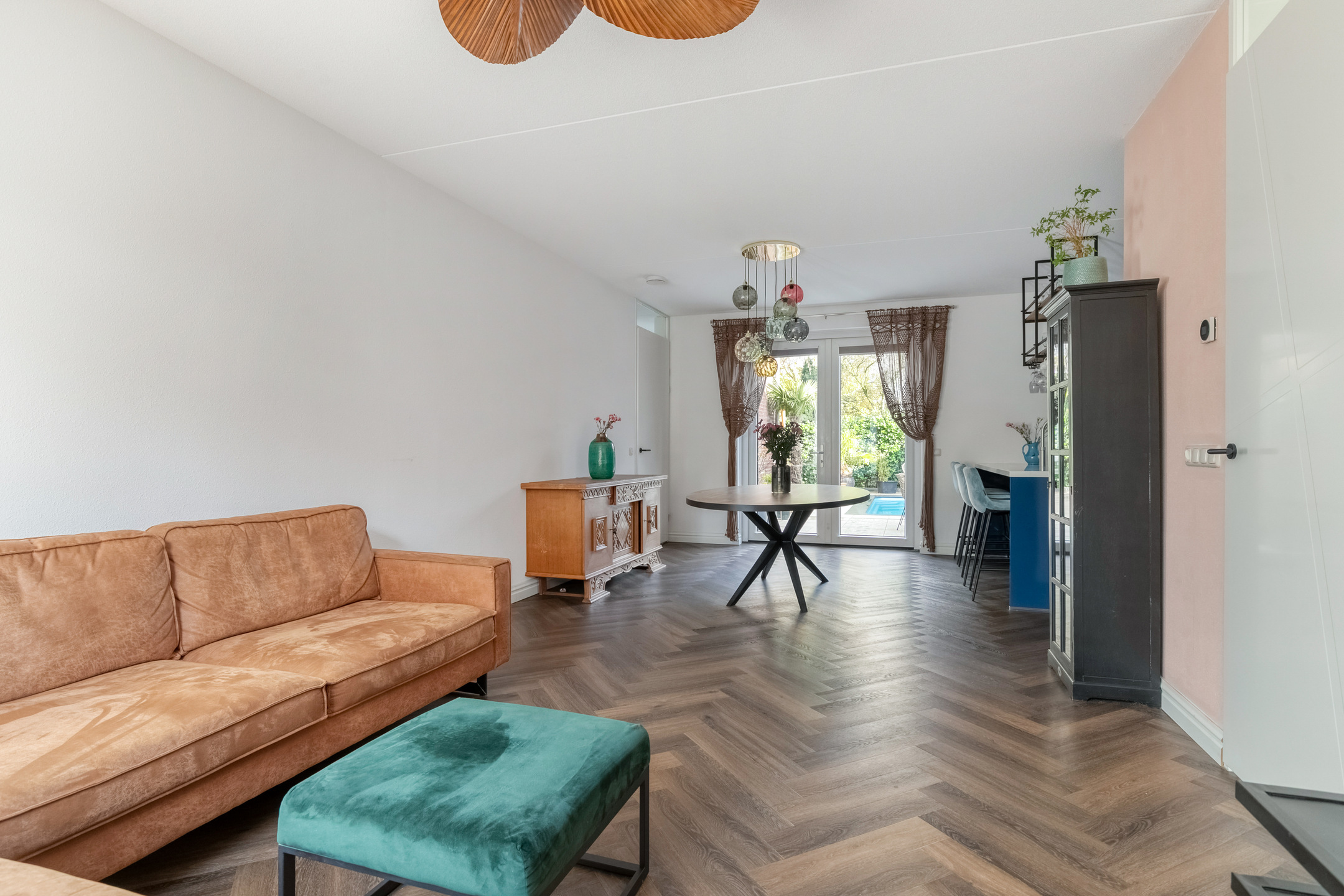 De woonkamer ademt warmte en gezelligheid. Dankzij de visgraatvloer, vloerverwarming en strak gestucte wanden ontstaat een moderne, huiselijke sfeer. De grote raampartijen zorgen voor veel lichtinval en contact met buiten. Vanuit de eethoek heeft u via de openslaande tuindeuren direct toegang tot de achtertuin – een prachtige verbinding tussen binnen en buiten.