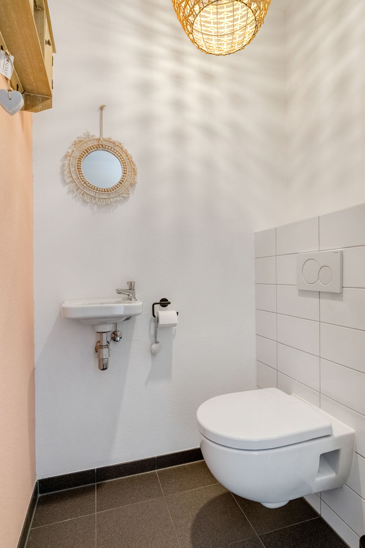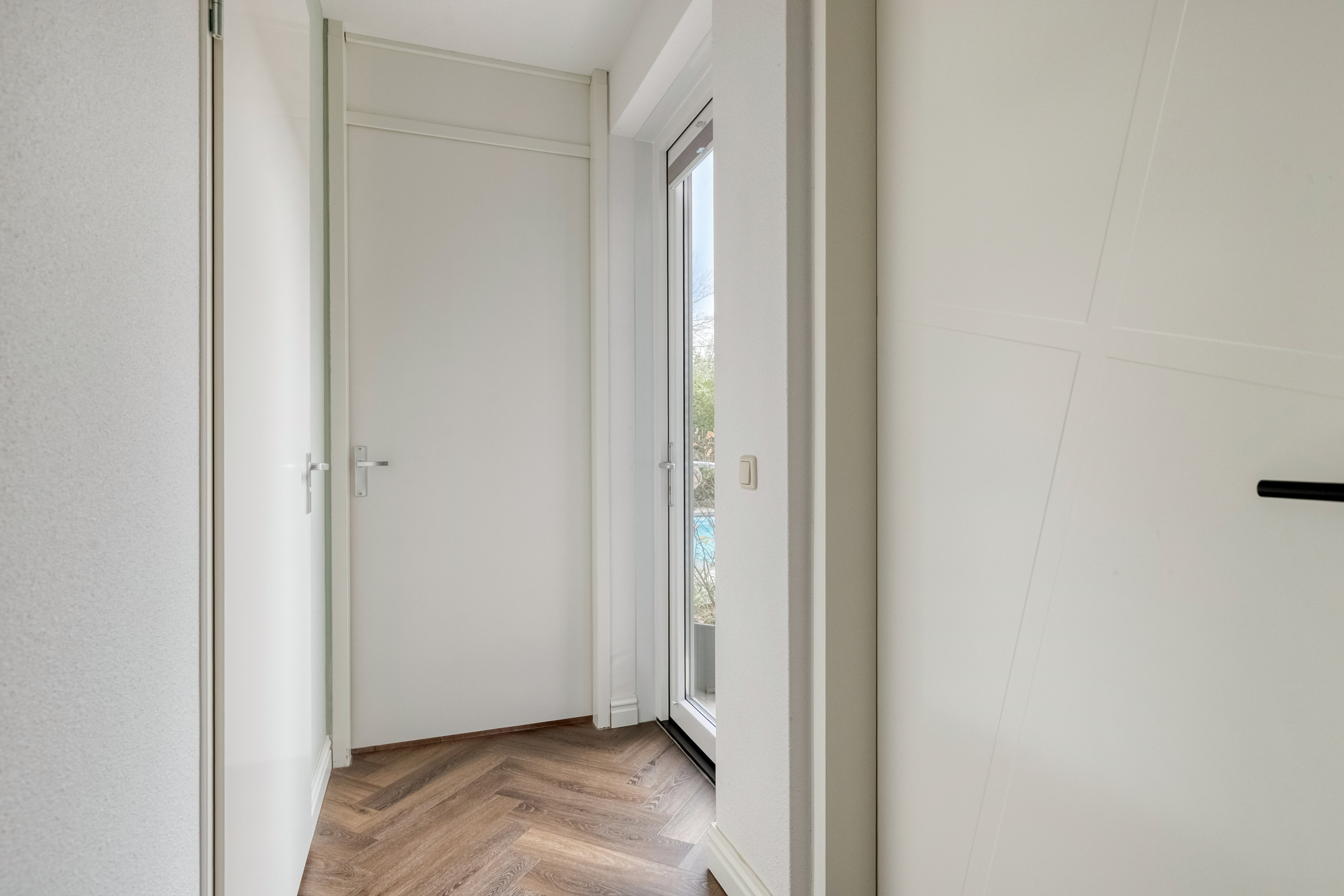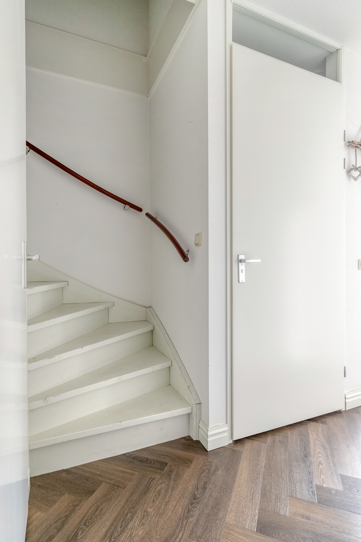 Via de entree betreedt u de ruime hal. Hier vindt u het gastentoilet, de meterkast, de provisiekast en de trapopgang naar de eerste verdieping. De hal is voorzien van een prachtige houtlook visgraat pvc-vloer met vloerverwarming, die doorloopt over de gehele begane grond. Dit zorgt voor een rustige, luxe uitstraling en een aangenaam wooncomfort.