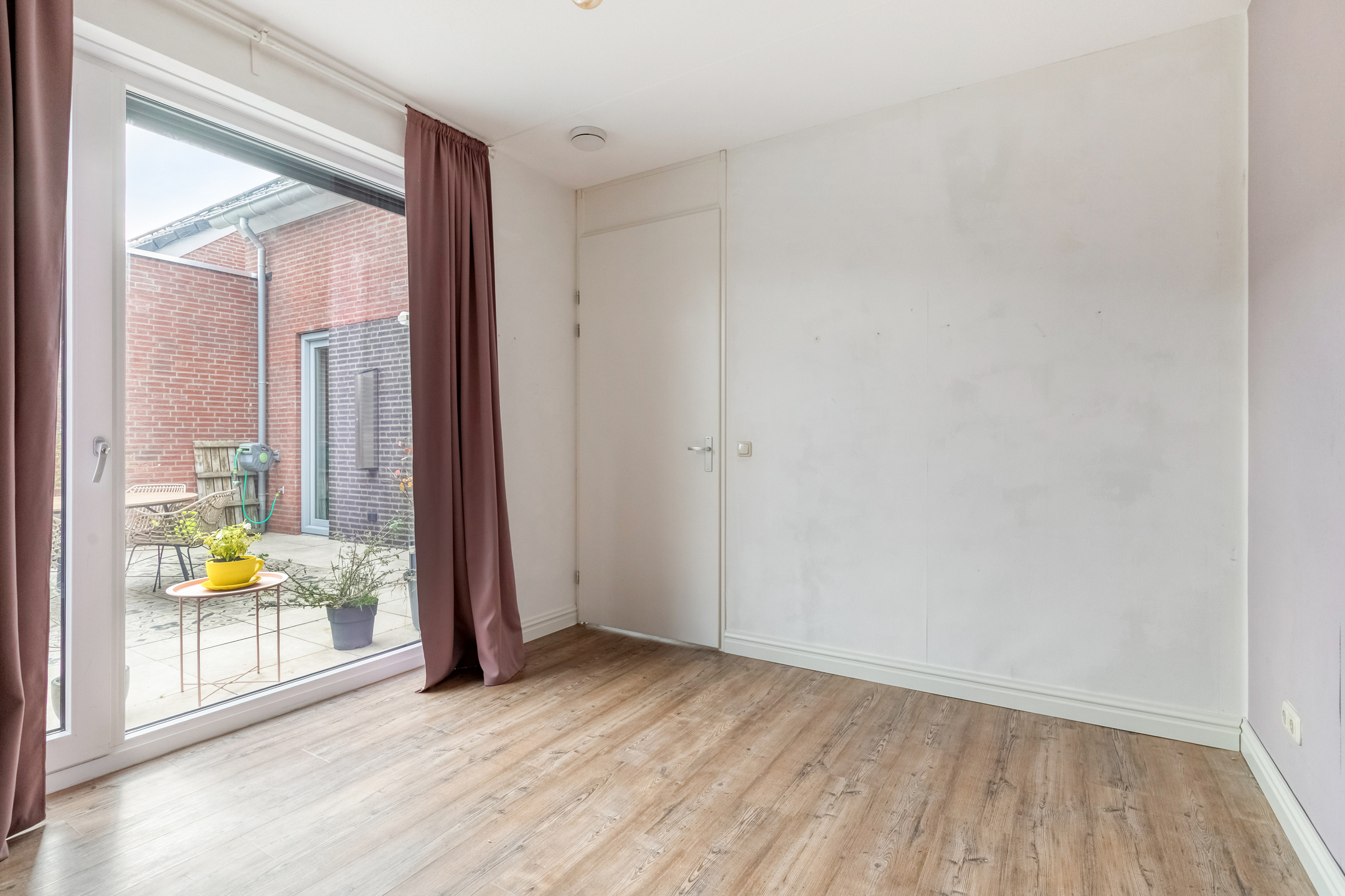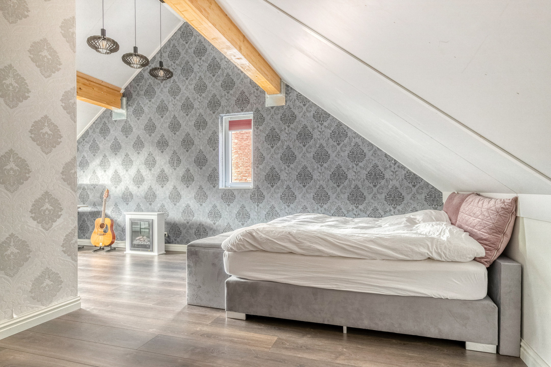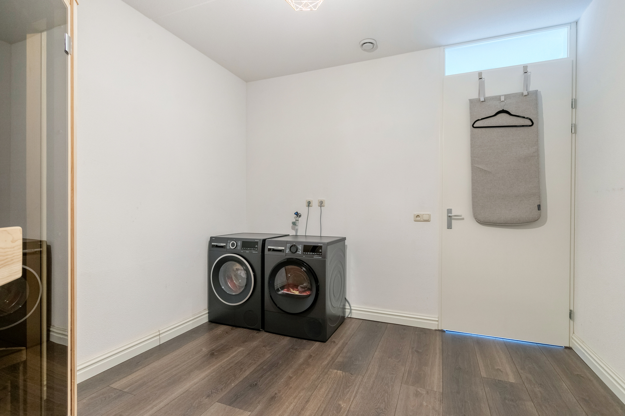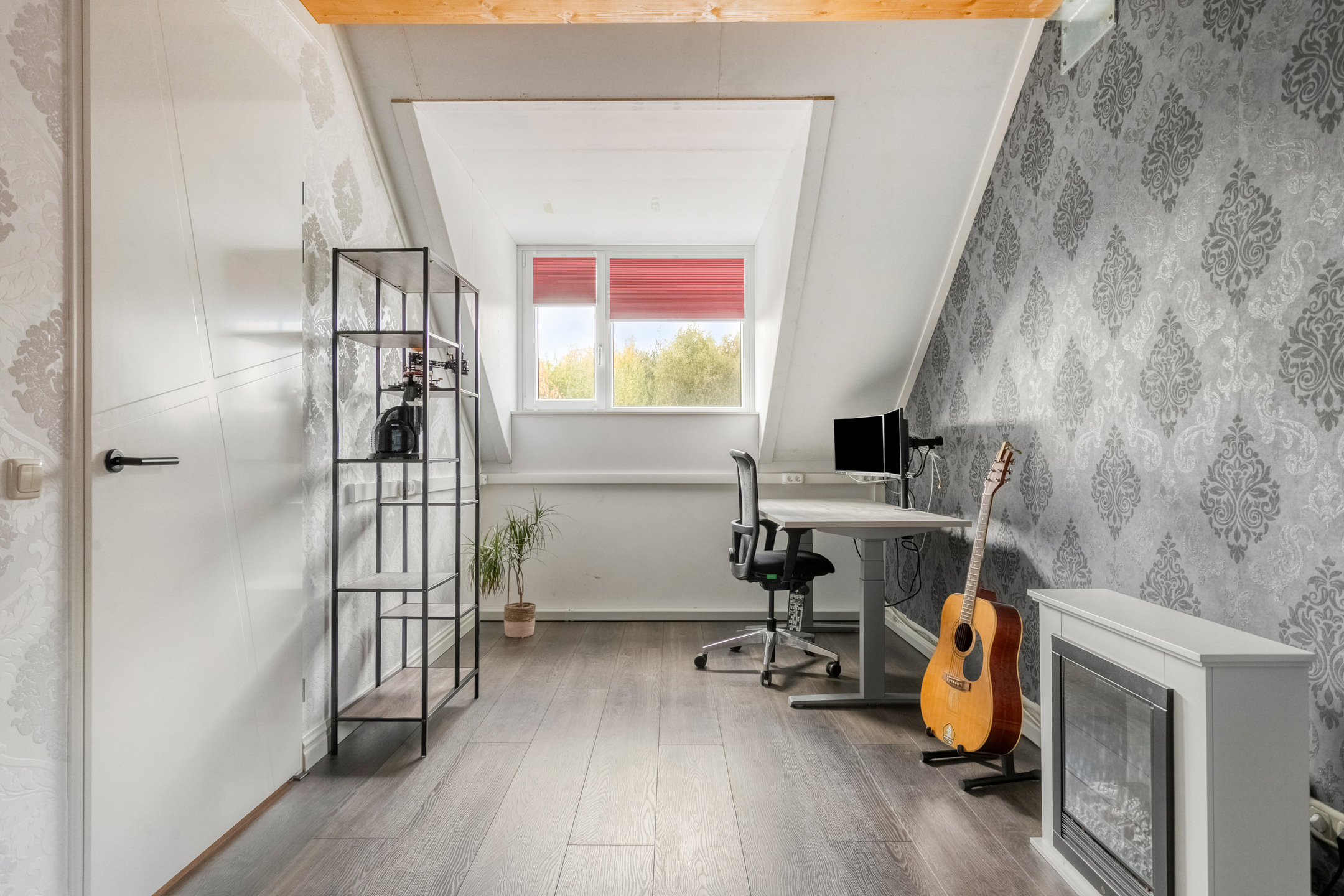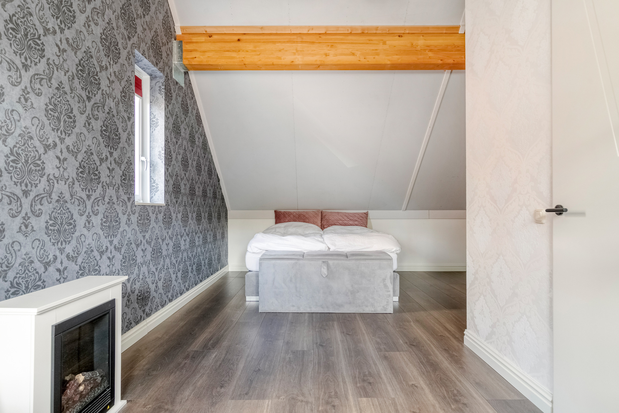 Een groot raam zorgt voor natuurlijke lichtinval en ventilatie, terwijl de technische installaties (zoals de warmtepomp) netjes zijn weggewerkt. Deze verdieping biedt volop mogelijkheden om naar eigen wens te gebruiken.