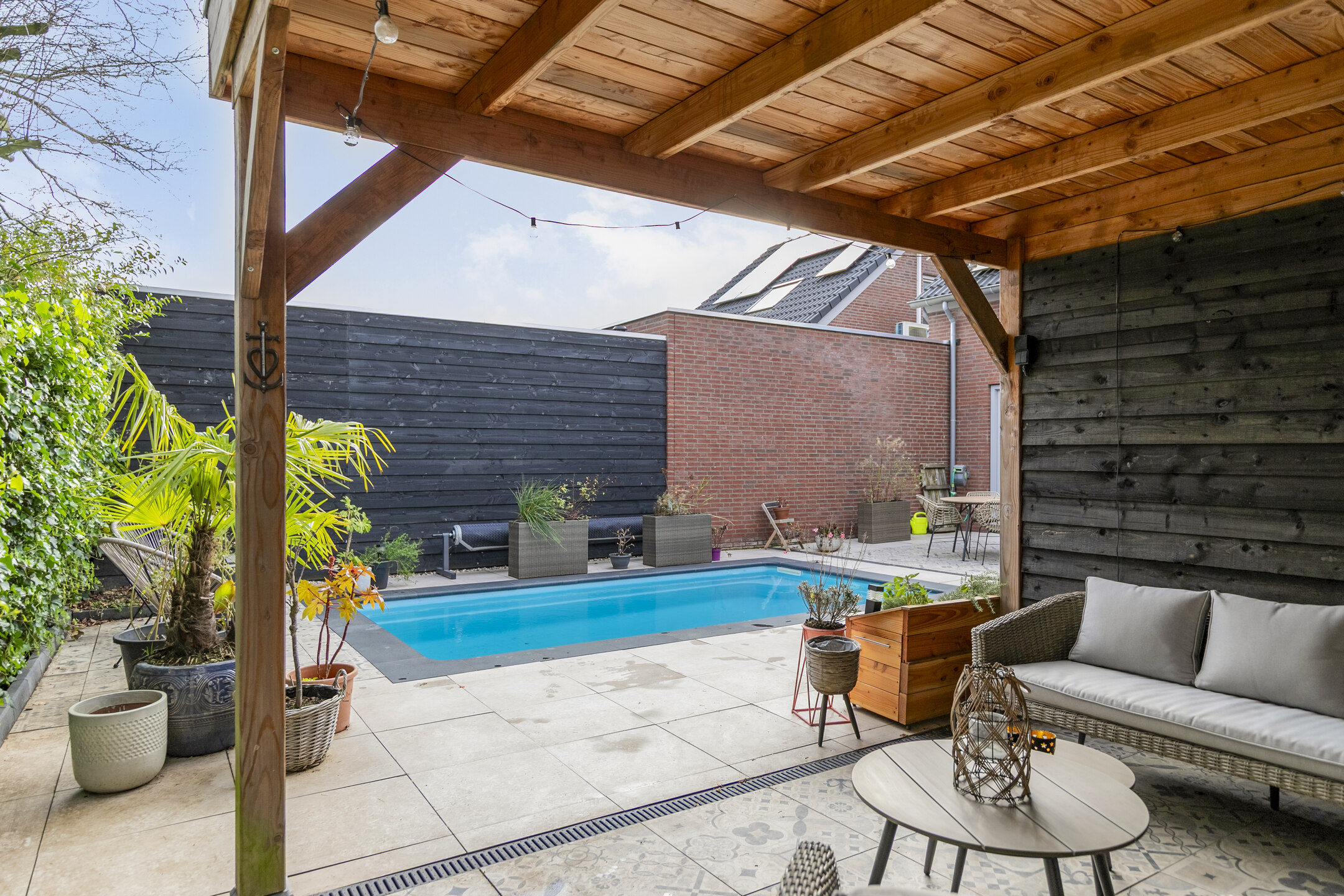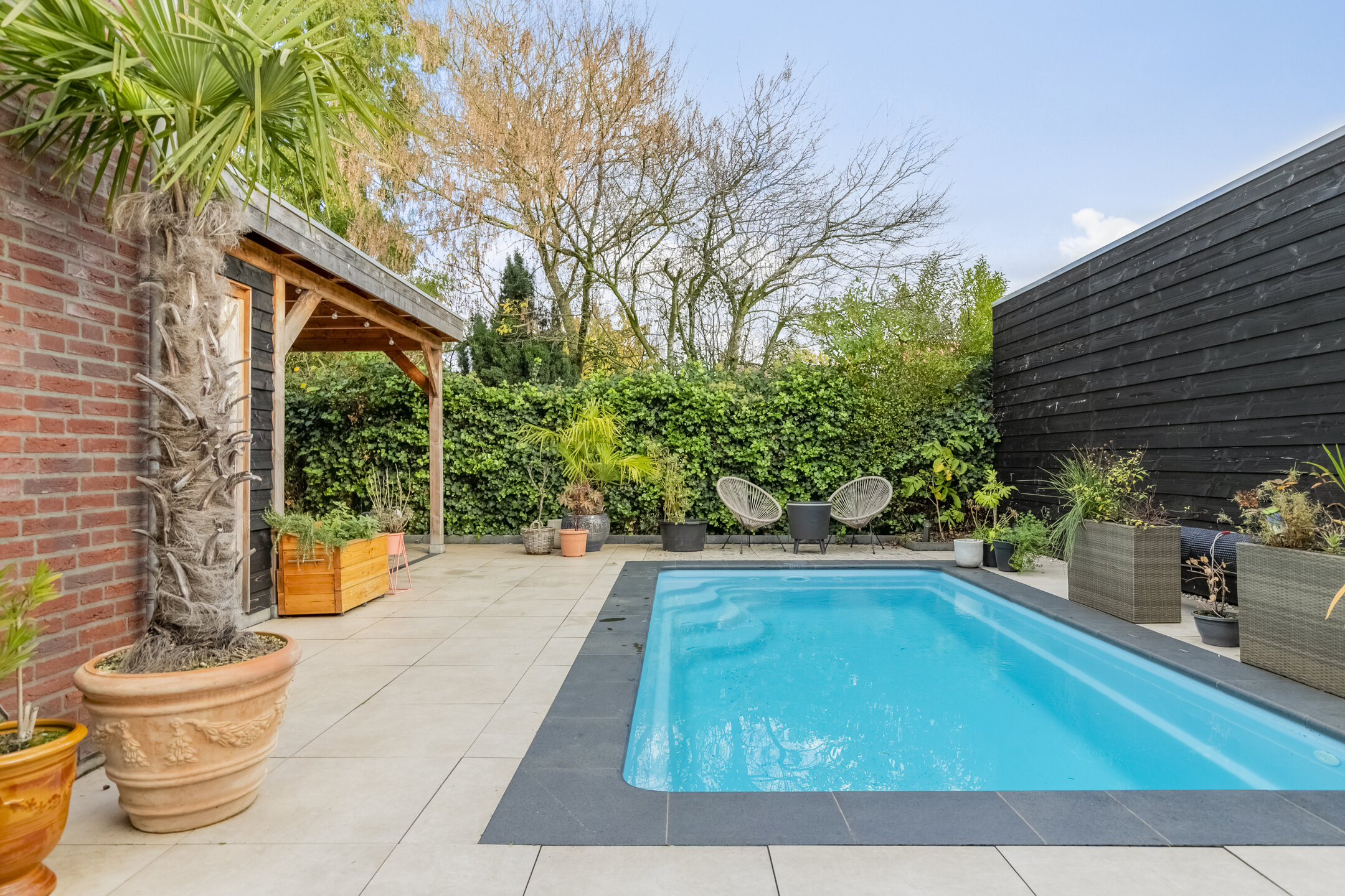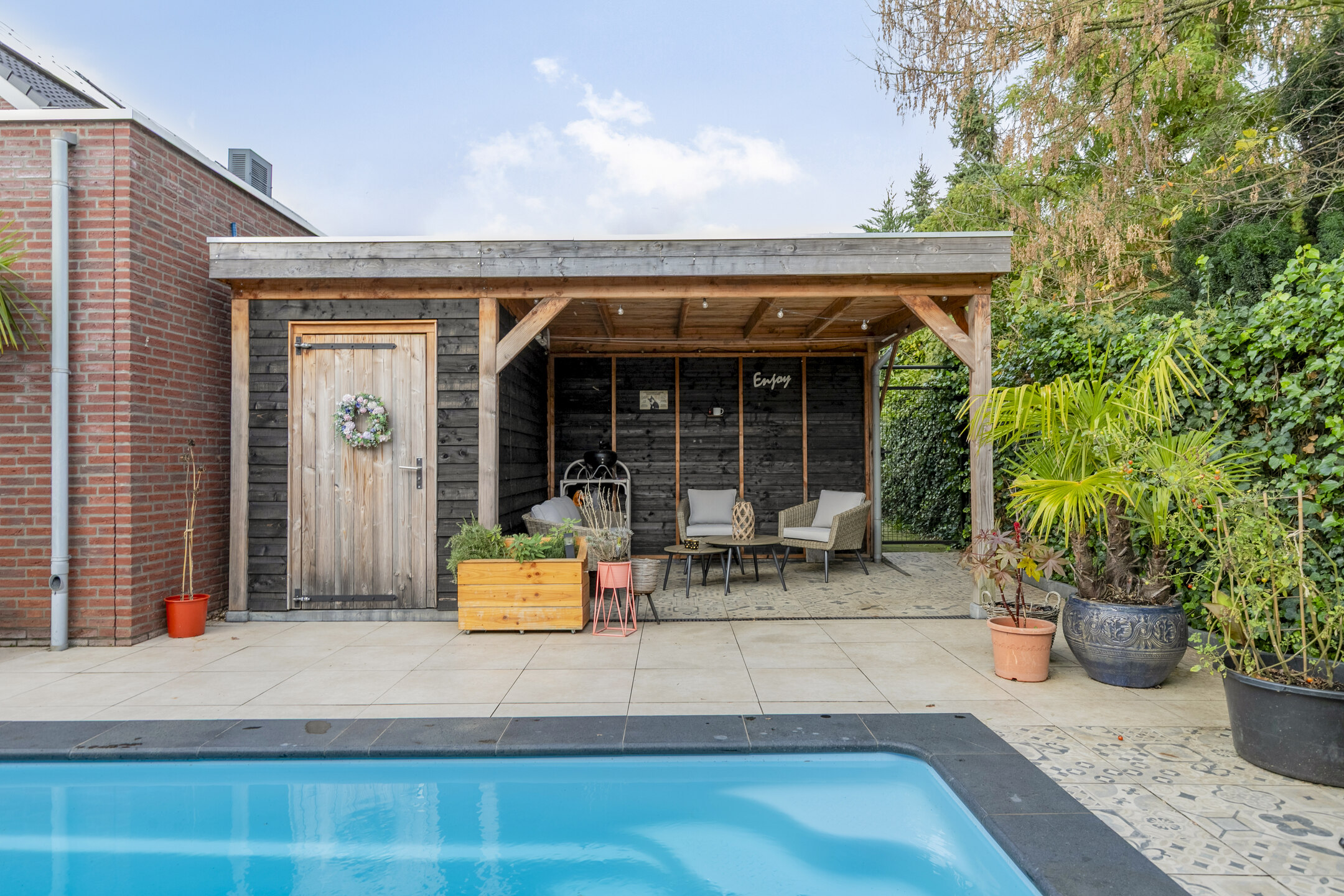 Het tuinhuis is uitgevoerd in een moderne zwarte houtlook en sluit qua stijl perfect aan bij het zwembad. Het zorgt voor extra privacy en geeft de tuin een exclusieve, eigentijdse uitstraling. Een ideale plek om te ontspannen, te genieten met vrienden of gewoon tot rust te komen.