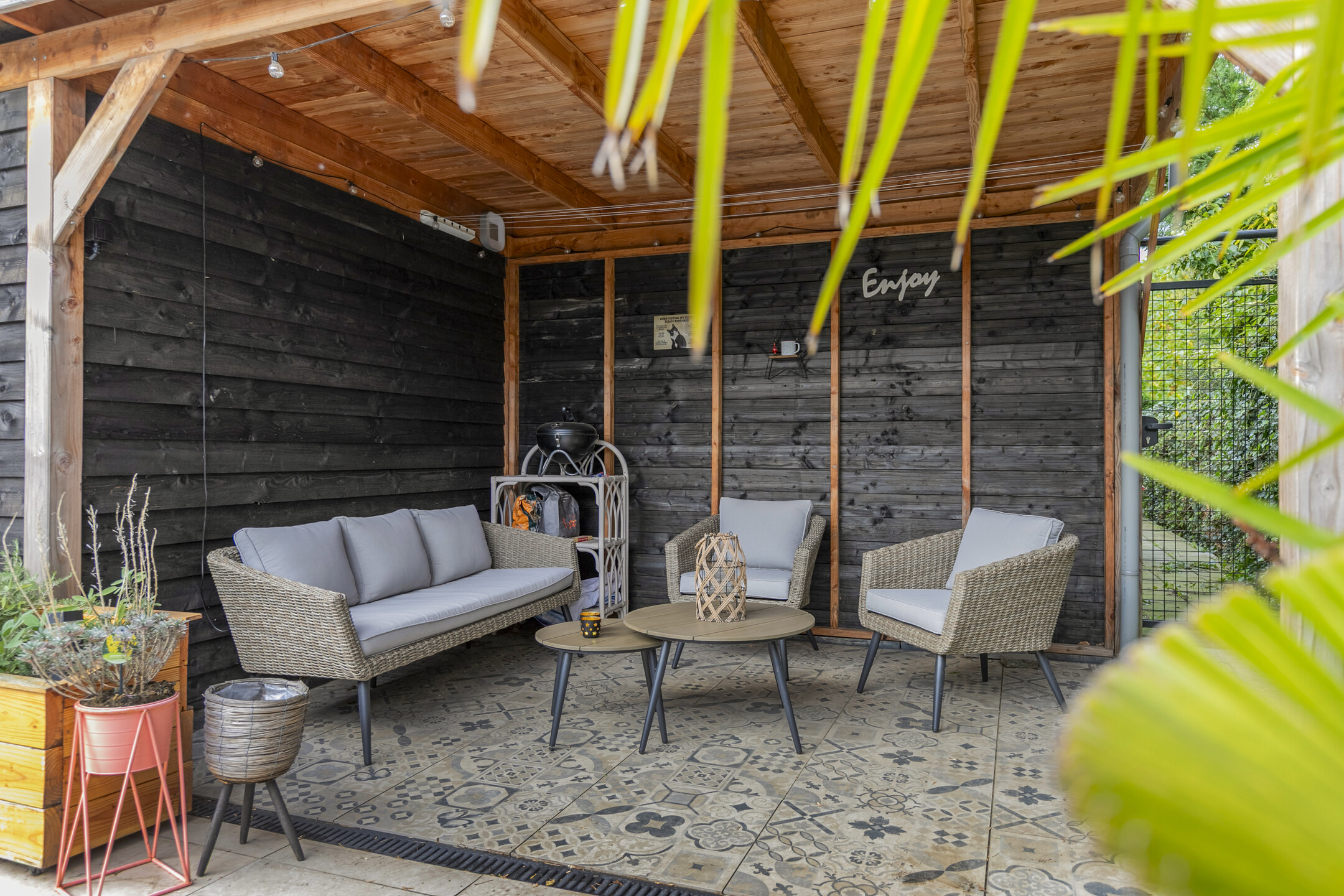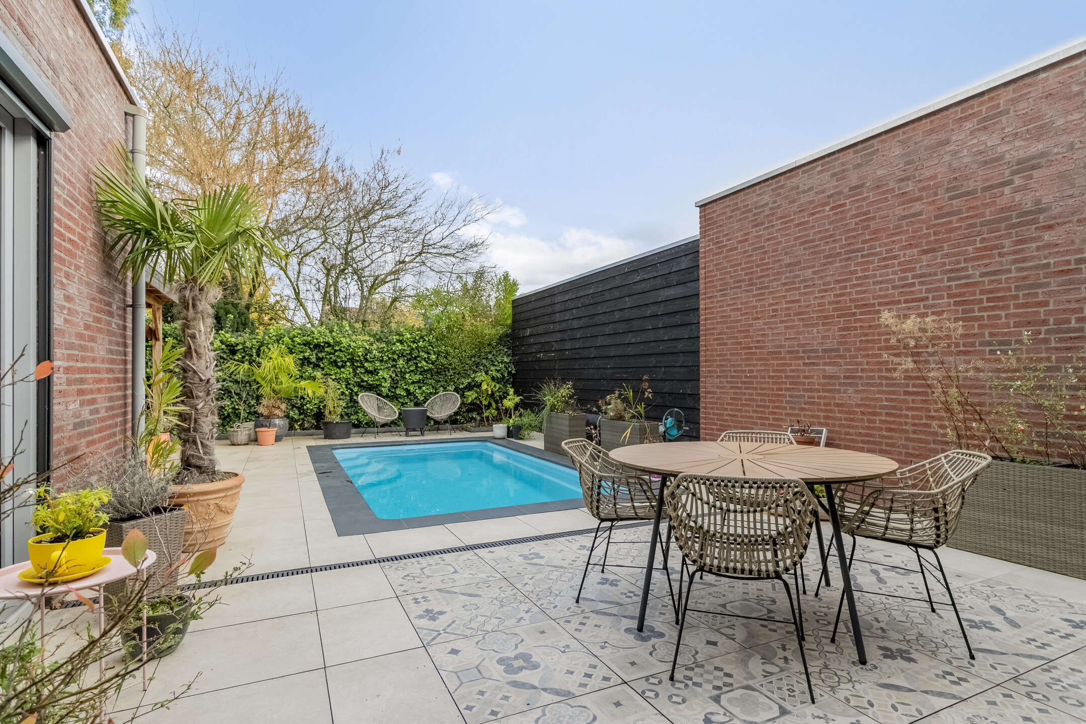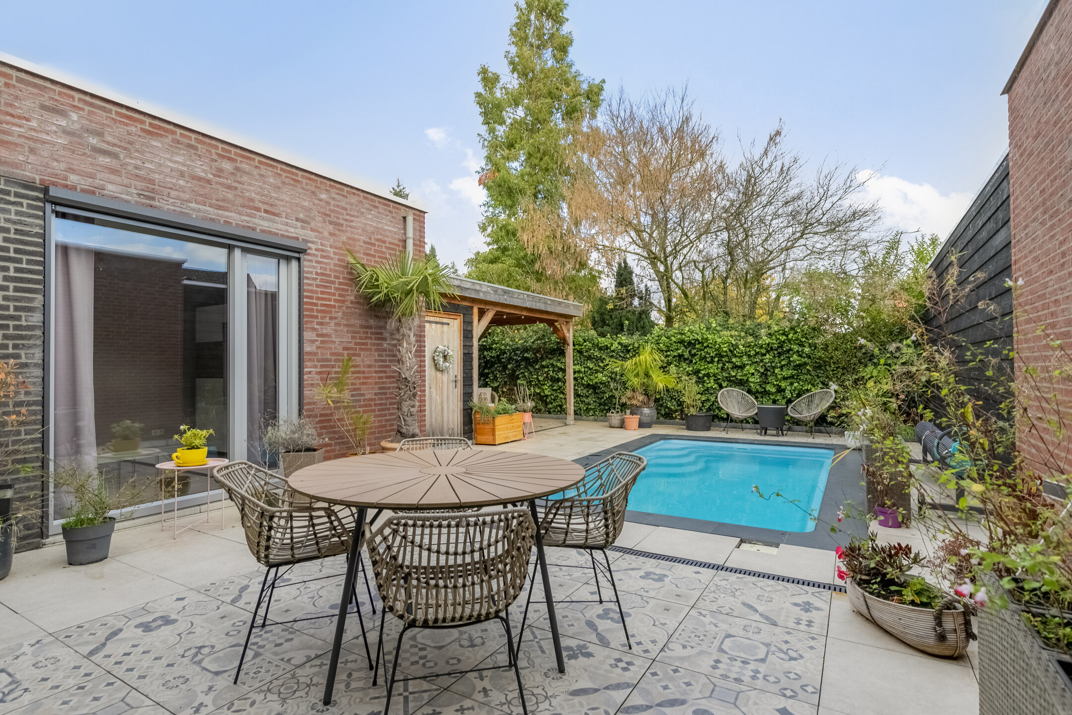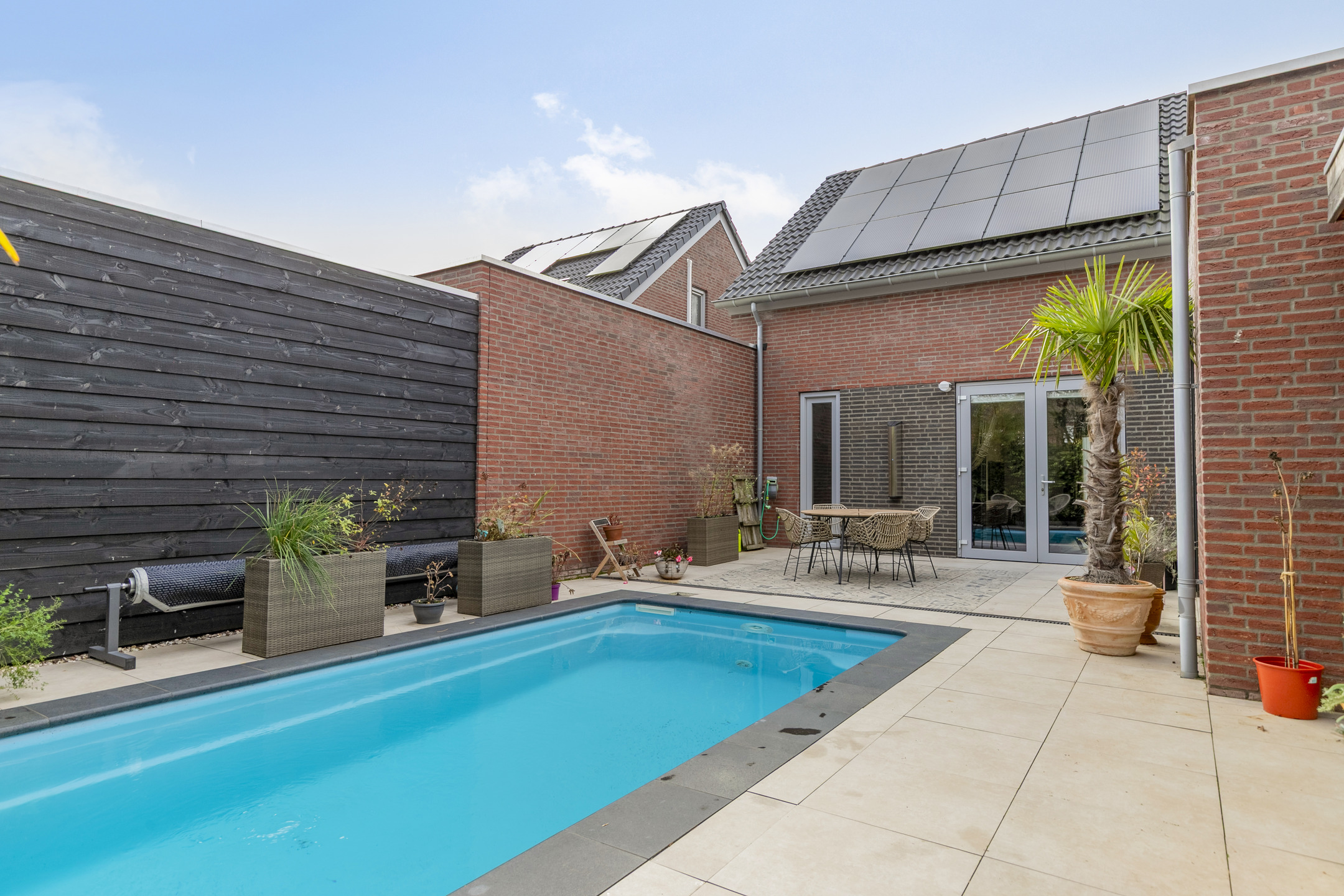 Het tuinhuis is uitgevoerd in een moderne zwarte houtlook en sluit qua stijl perfect aan bij het zwembad. Het zorgt voor extra privacy en geeft de tuin een exclusieve, eigentijdse uitstraling. Een ideale plek om te ontspannen, te genieten met vrienden of gewoon tot rust te komen.