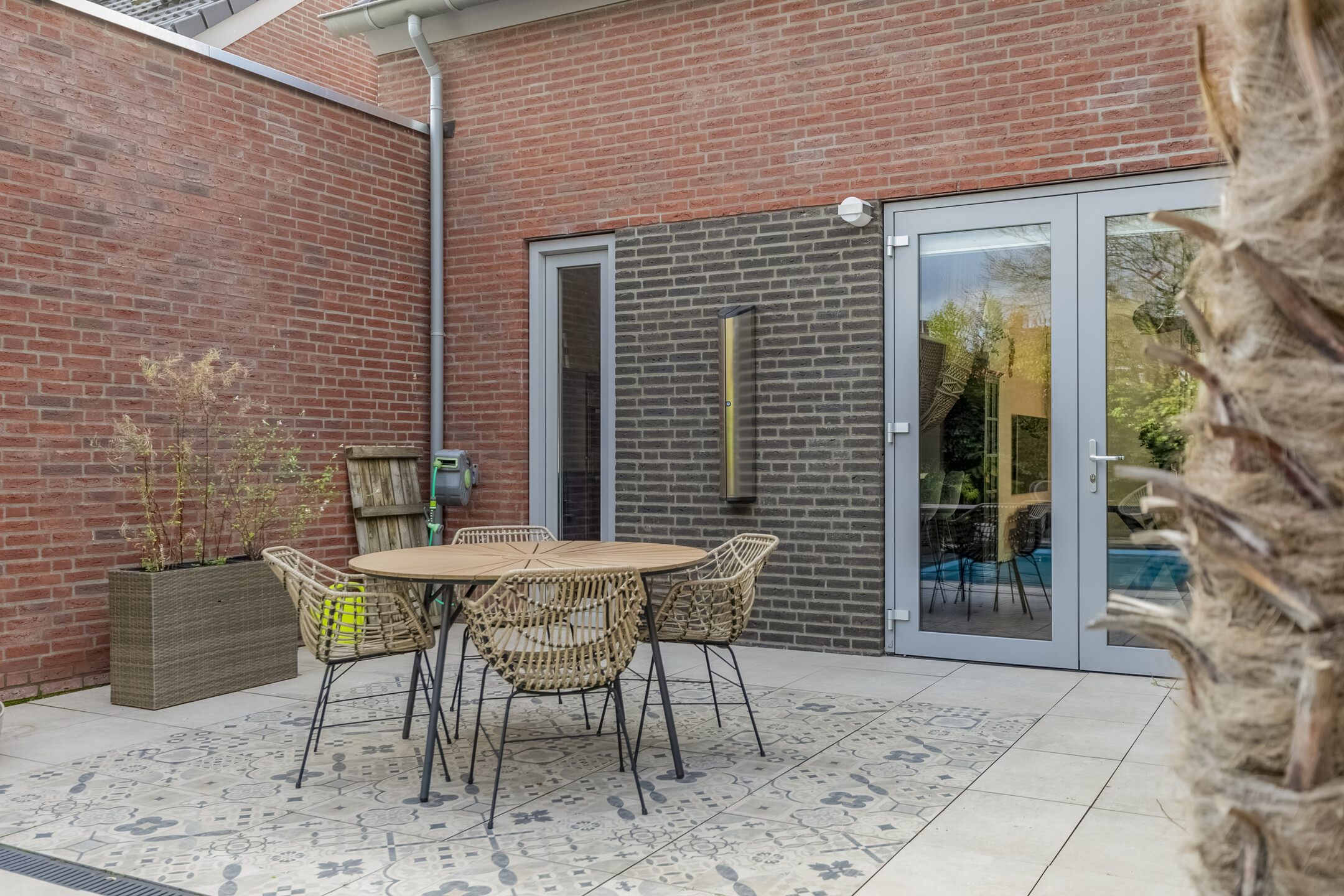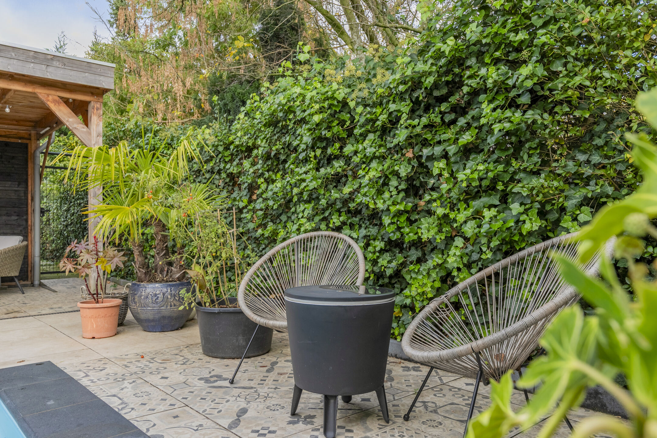 De achtertuin is een ware eyecatcher. Gelegen op het noordoosten kunt u hier volop genieten van de zon, maar ook van de schaduw op warme dagen. Direct achter de woning ligt een ruim betegeld terras, perfect voor een gezellige zithoek of eettafel.