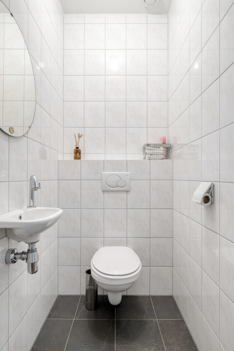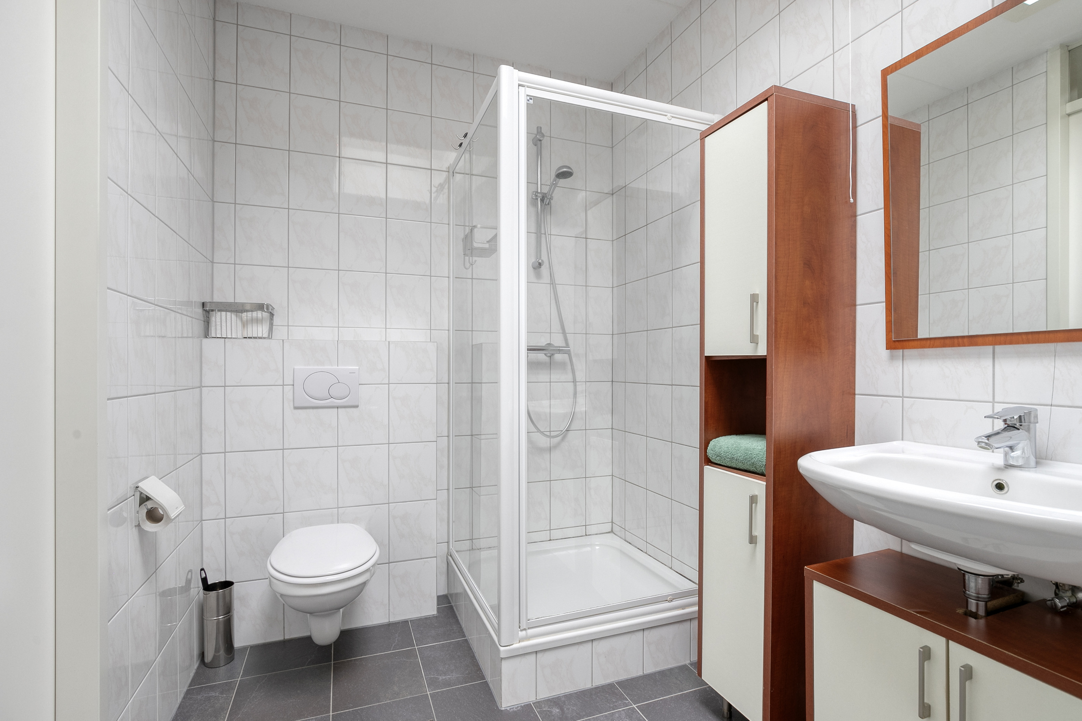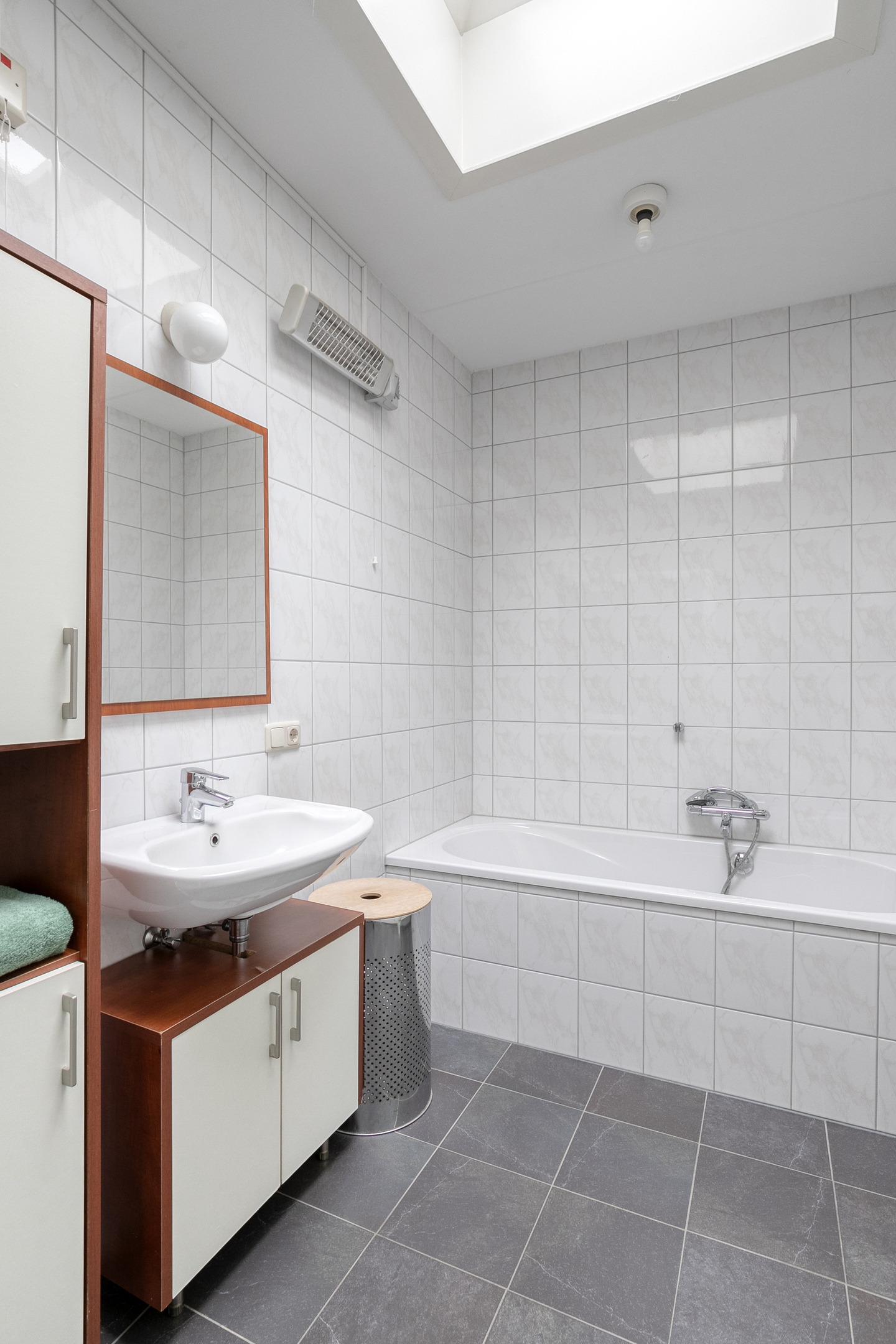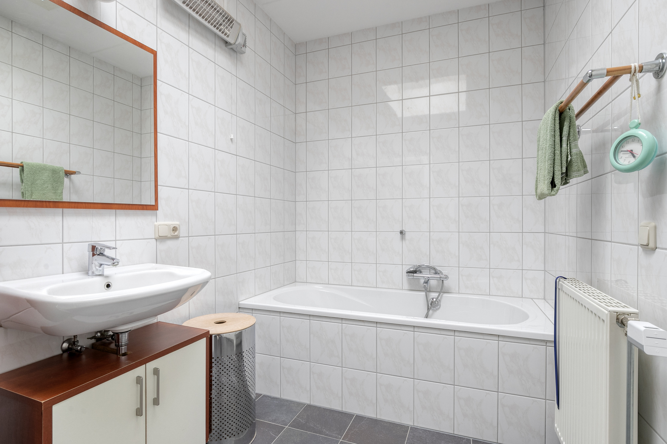 Deze volledig betegelde badkamer is niet alleen strak afgewerkt, maar ook heerlijk comfortabel. Voor extra warmte is er daarnaast een radiator aanwezig. Verder is de badkamer voorzien van een douche met cabine, een ligbad, een wastafel met bijpassend meubel, een toilet en mechanische ventilatie die zorgt voor een frisse luchtcirculatie. Door de volledige betegeling is de badkamer bovendien makkelijk in onderhoud, ideaal voor dagelijks gebruik.