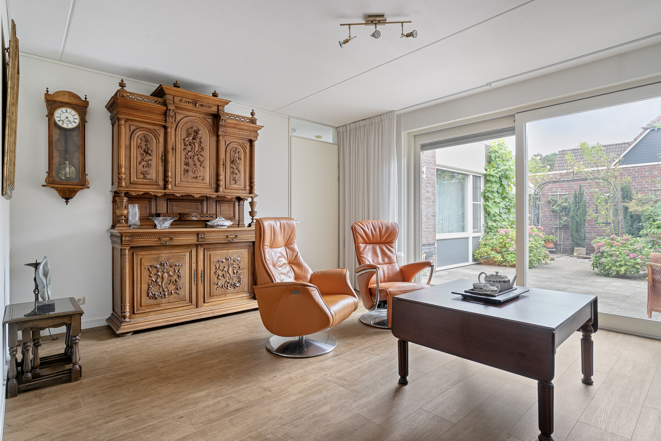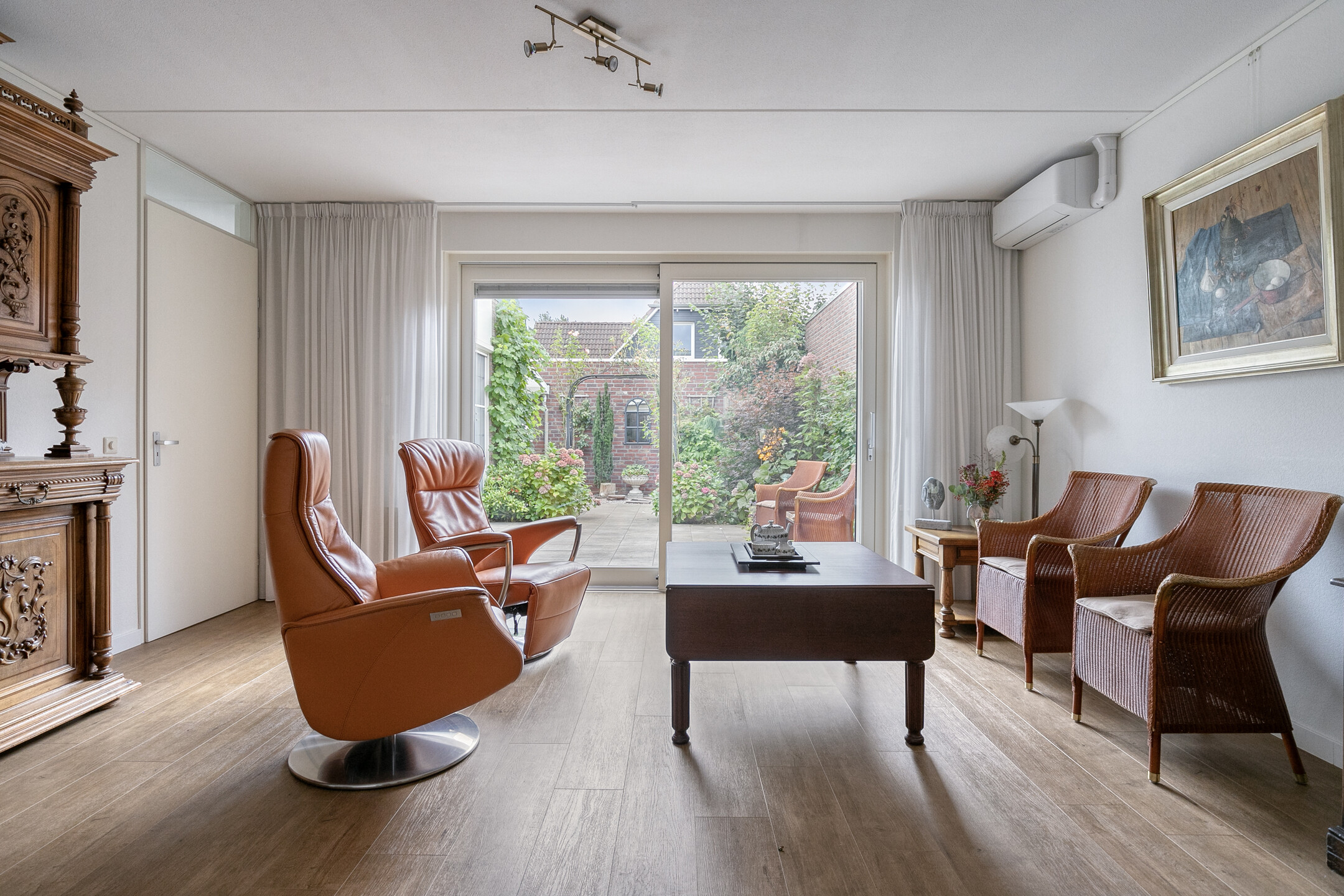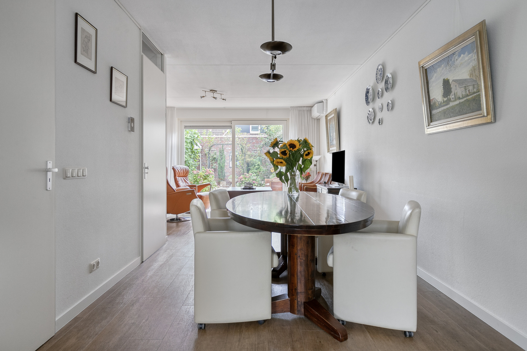 Deze prachtige woonkamer is het hart van de woning. Dankzij de royale schuifpui geniet u van een overvloed aan daglicht en een sfeervolle verbinding met de tuin. Het vele glas zorgt voor een open en ruimtelijk gevoel, waardoor woon- en eetkamer naadloos in elkaar overlopen en ook de keuken optimaal wordt verlicht. De ruimte is uitgerust met een comfortabele airconditioning, zodat u zowel in de zomer als in de winter verzekerd bent van een aangenaam klimaat. Vanuit de woonkamer heeft u directe toegang tot de keuken, de tuin en de hal. Via deze hal bereikt u de badkamer, de slaapkamer en de garage, waardoor alle voorzieningen praktisch en dichtbij gelegen zijn. de woon/eetkamer is tevens voorzien van een ruime en praktische provisiekast gesitueerd onder de trap.
