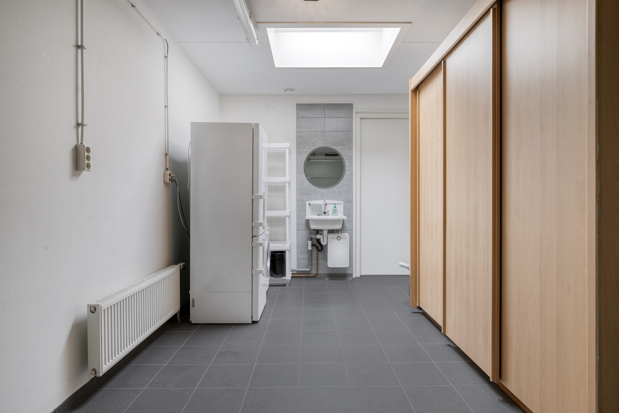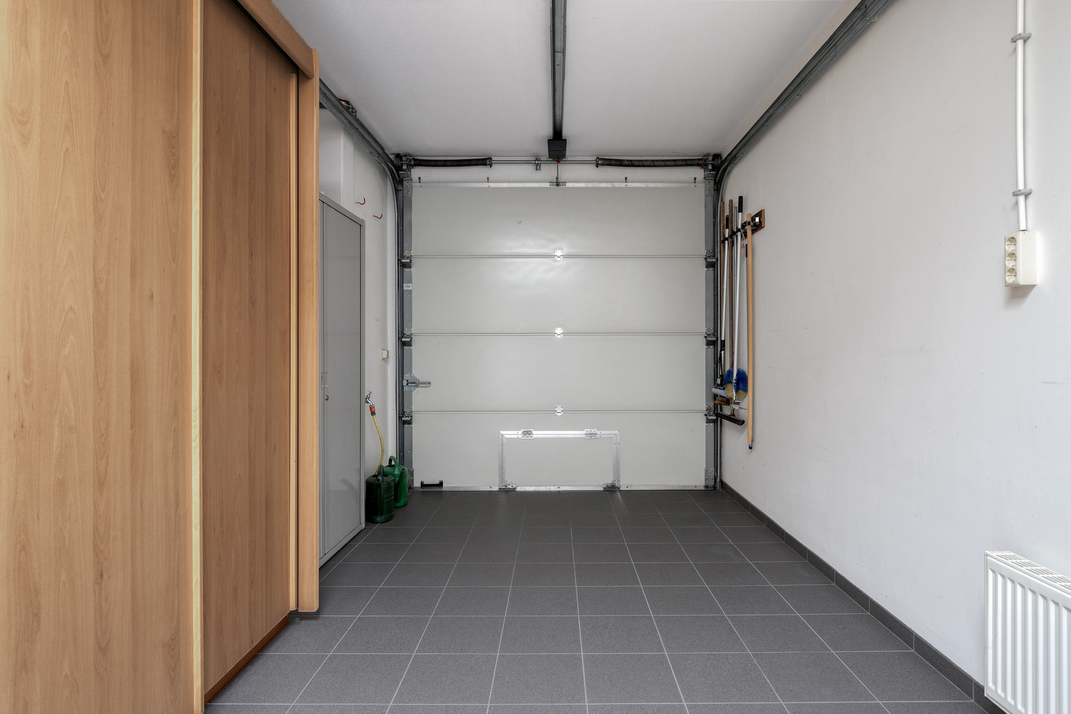 De royale garage (circa 19 m²) is bereikbaar via zowel de voorzijde van de woning als de hal in de woning. De ruimte is ideaal voor het stallen van fietsen of gereedschap en biedt daarnaast praktische extra opbergmogelijkheden. Tevens kunt u hier ook indien gewenst uw auto parkeren. De garage vloer is voorzien van een tegelvloer en heeft tevens de aansluitingen voor het witgoed.